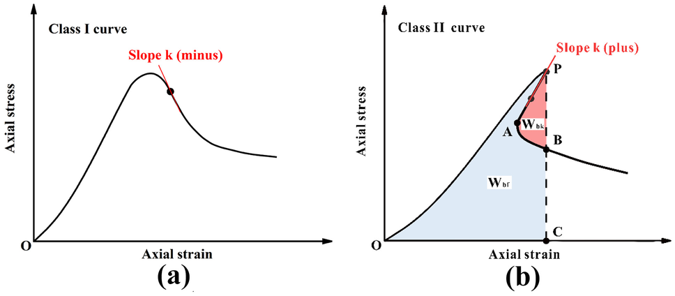 Schematic stress–strain curves of a Class I rock and b Class II rock under uniaxial compression. Wbk is the intrinsic burst energy density, representing the strain energy in the rock transformed to kinetic energy during strainburst. Wbf is the strain energy dissipated by rock fracturing