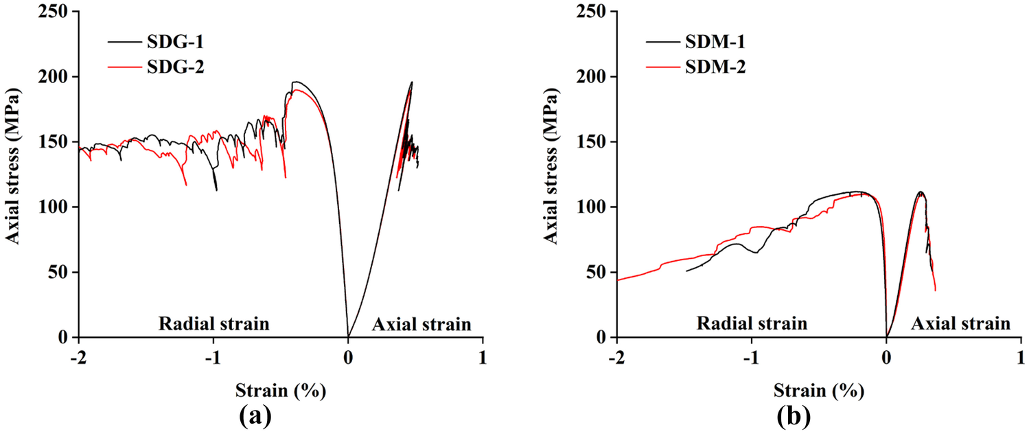 Axial stress–strain curve of specimen SDG-2 under uniaxial compression