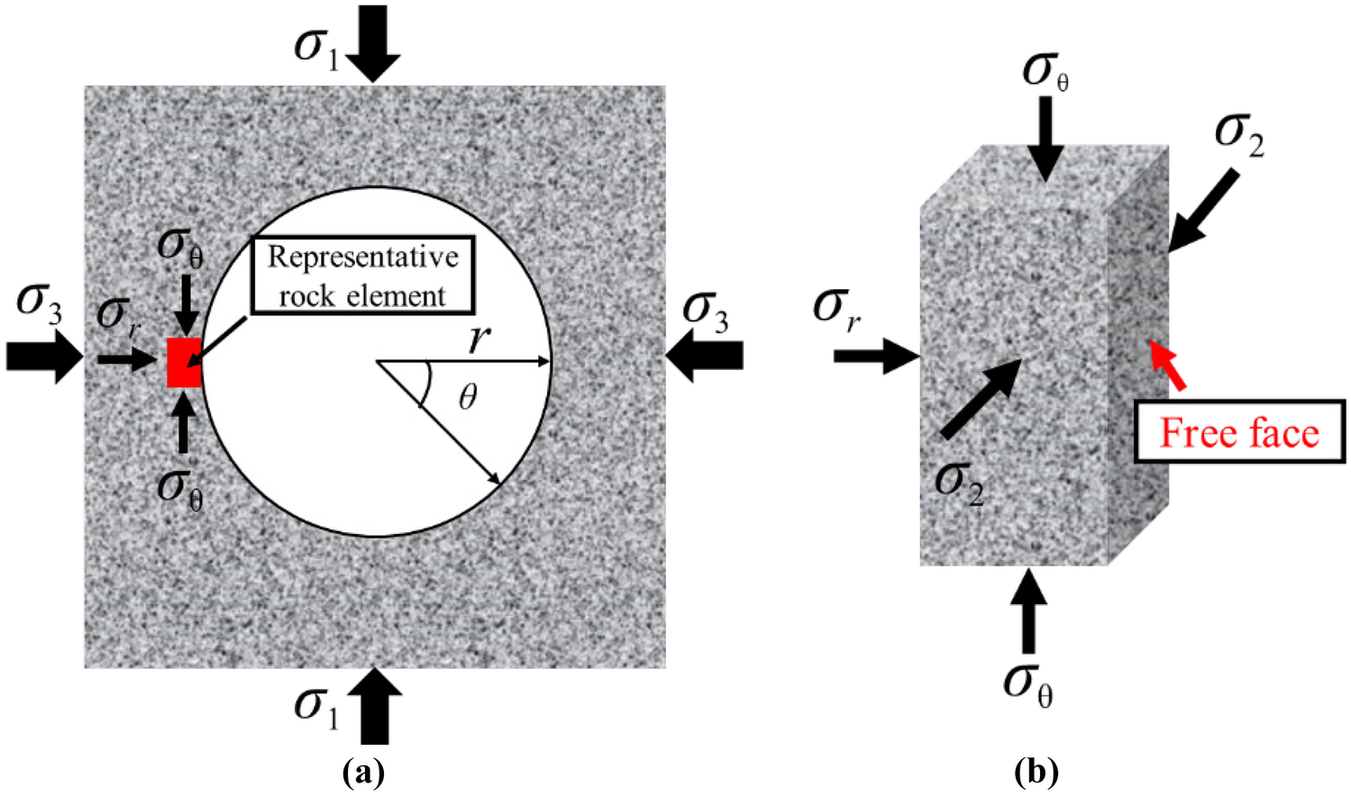 Sketches of the stress state of a the rock element in the tunnel sidewall on the site and b the rock element for the single-free-face TTC test in the laboratory