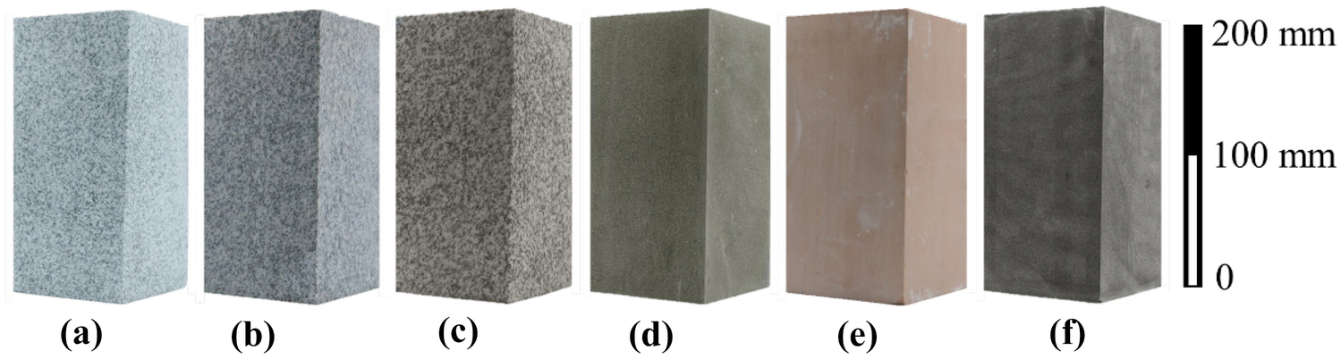 Prismatic specimens of six of the rock types tested. a Jinzhou granite, b Shandong granite, c Beishan granite, d Shenyang sandstone, e Yunnan sandstone, and f Chifeng basalt