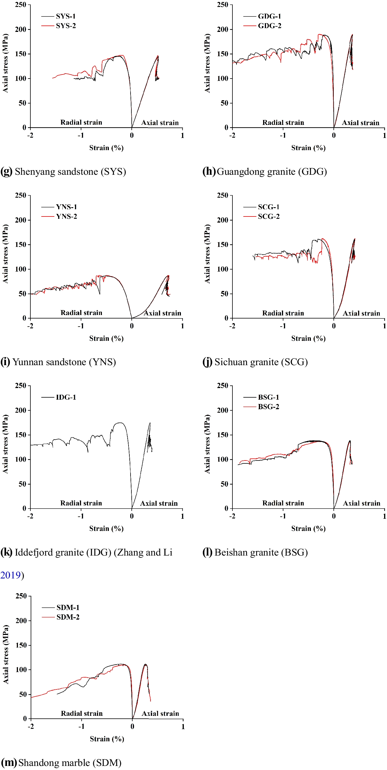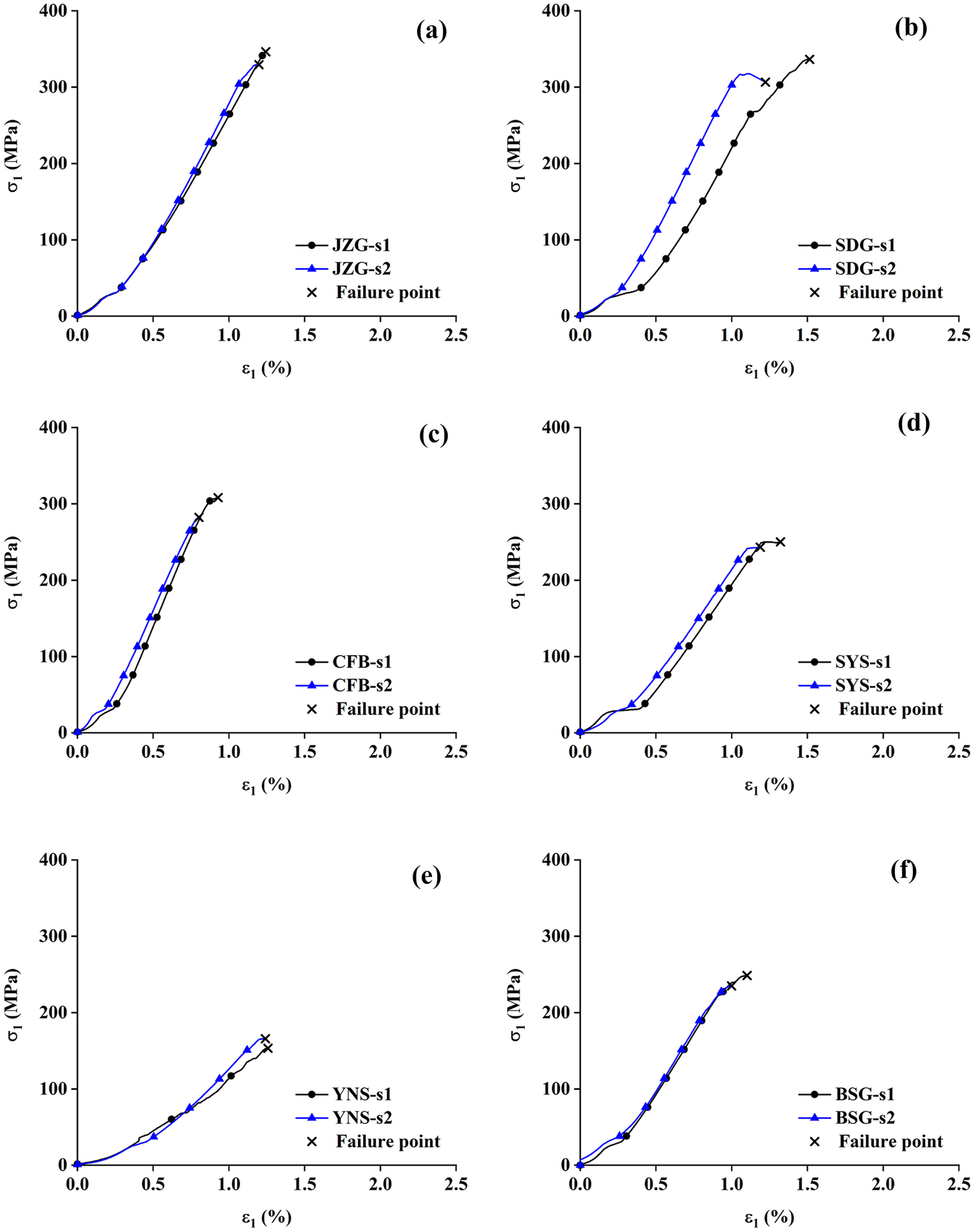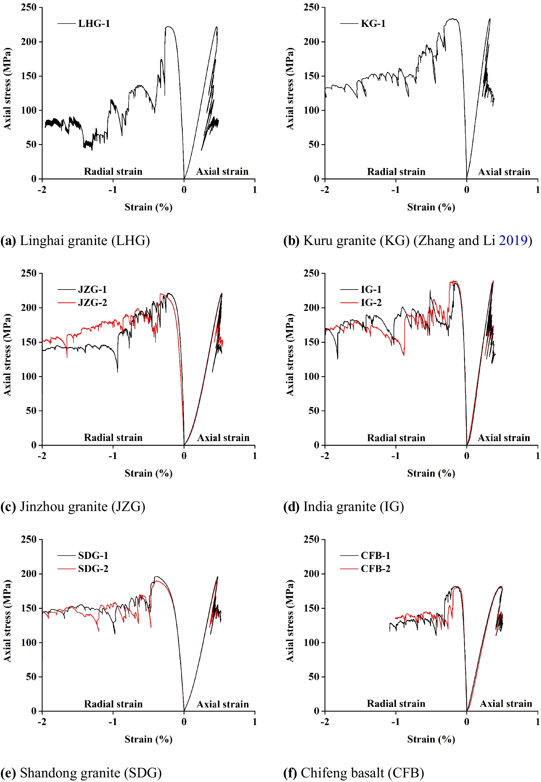The σ1–ε1 curves of all rock specimens in the single-free-face TTC tests. a Jinzhou granite, b Shandong granite, c Chifeng basalt, d Shenyang sandstone, e Yunnan sandstone, and f Beishan granite
