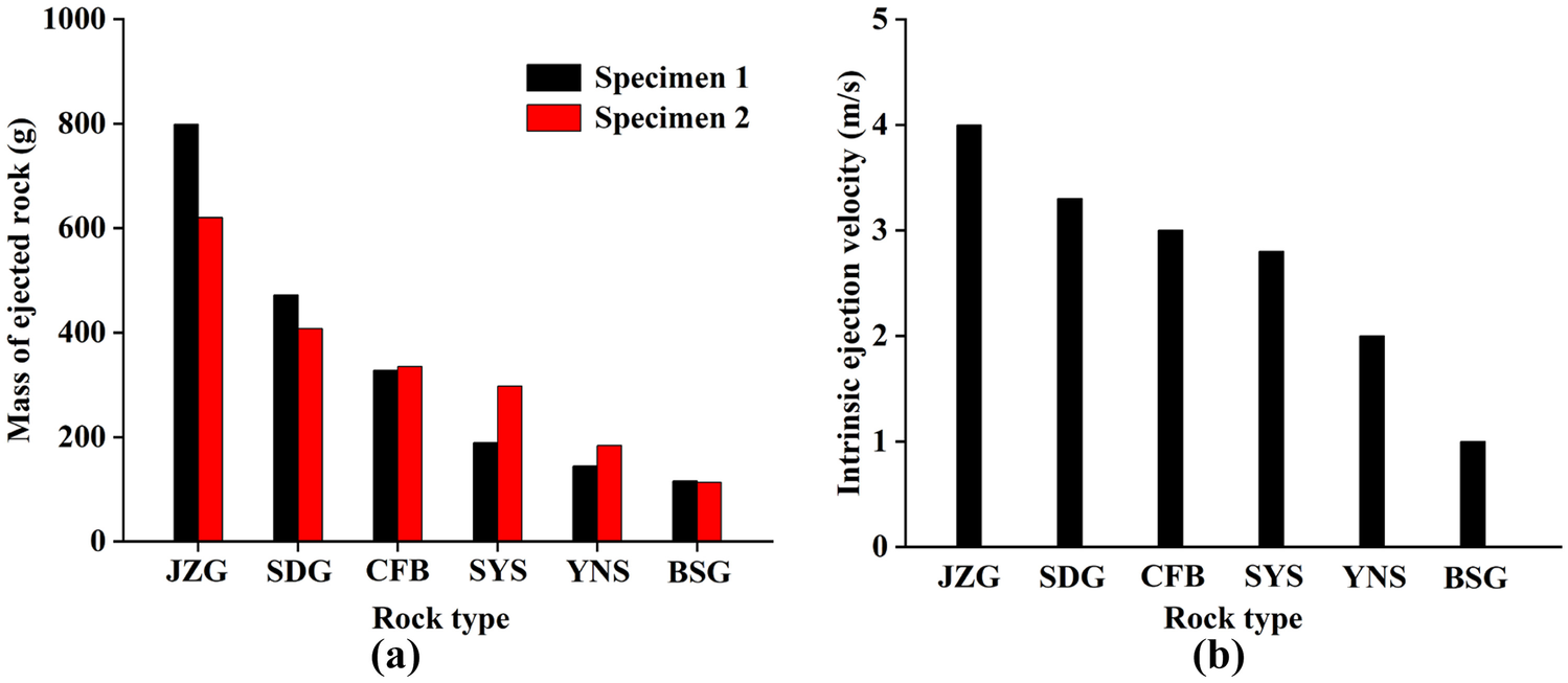 In the laboratory tests, rock at the surface was fragmented and ejected from the specimen during a strainburst. The distance of the ejected rock is a measure of the kinetic energy and so the intensity of the strainburst. However, such a distance is difficult to determine because the ejected rock fragmented and the fragments landed all around the specimen. It has been observed that the mass of the ejected rock is proportional to the intensity of strainburst. The mass of the ejected rock fragments is used to approximately assess the intensity of the burst. The masses of the ejected rock fragments of each specimen were collected and weighed after the tests, which are presented in Fig. 9a. As seen in the diagram, the masses of the ejected rock fragments were similar for the two specimens of each rock type. This indicates good repeatability in the burst volume of a given rock type. The average masses of the ejected rock of the six rock types were 709.6 g for JZG, 439.4 g for SDG, 331.4 g for CFB, 243.2 g for SYS, 164.1 g for YNS, and 114.8 g for BSG, respectively, which are 13.4%, 8.4%, 5.7%, 4.7%, 3.7%, 2.2% of the mass of the specimens.The intrinsic ejection velocities of the six rock types, calculated from the stress–strain curves, are presented in Fig. 9b for comparison. It should be noted that the order of the six rock types of the mass of ejected rock in Fig. 9a is the same as the order of the intrinsic ejection velocity in Fig. 9b.