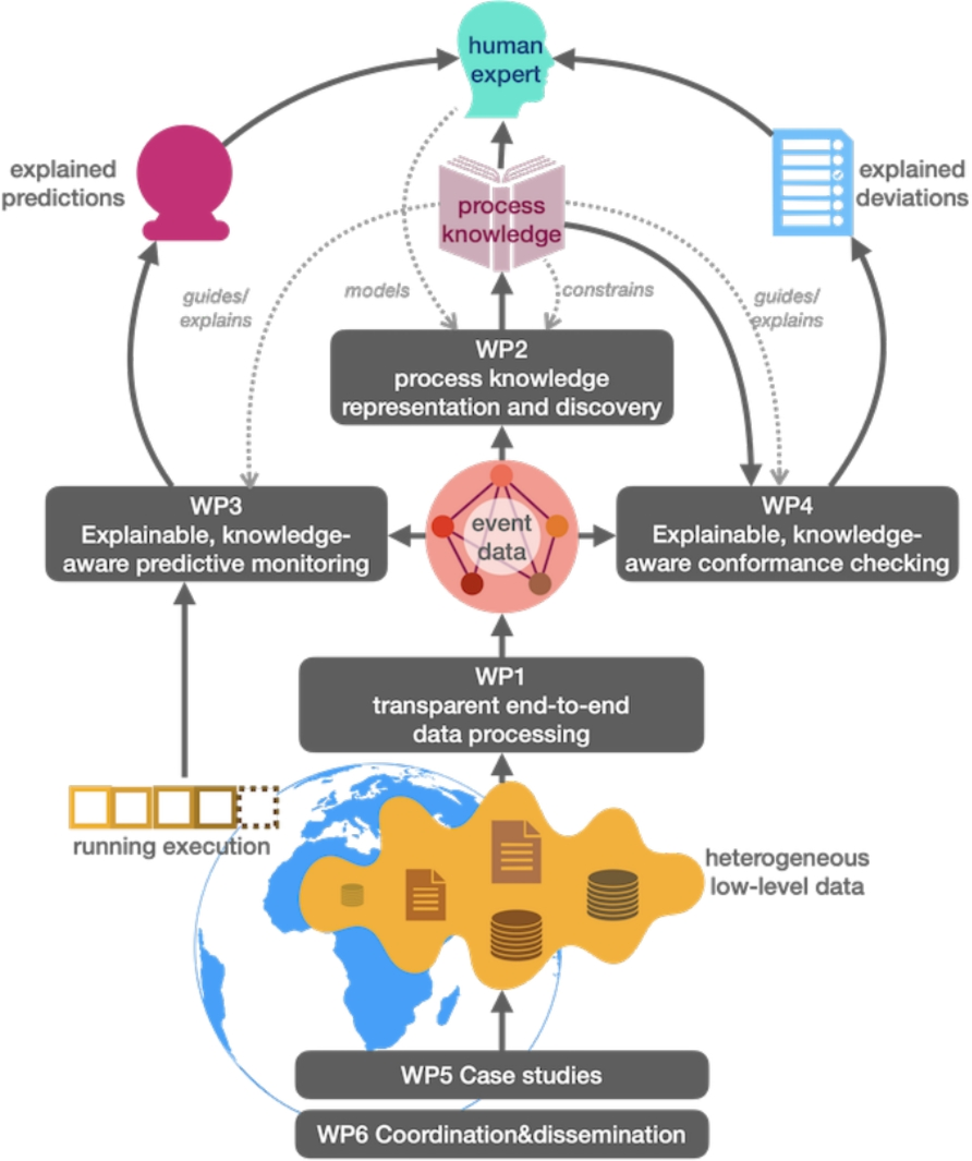 Specifically, Sect. 2 describes work on transparent, end-to-end data processing, led by the unit at the Free University of Bozen-Bolzano; Sect. 3 focuses on Process Knowledge Representation and Discovery, coordinated by the unit at the University of Milano-Bicocca; Sect. 4 presents WP3 Explainable, Knowledge-Aware Predictive Monitoring, with leadership by the unit at ICAR-CNR; Sect. 5 consolidates the contributions to WP4 Explainable, Knowledge-Aware Conformance Checking, led by the unit at Sapienza University of Rome, and WP5 Application of Explainable Process-Aware Intelligence, coordinated by the research unit at the University of Calabria. This work lies within the scope of WP6: coordination and dissemination.