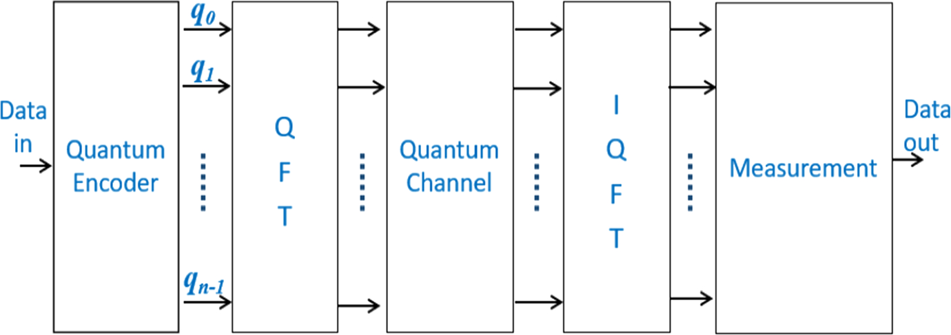Q-OFDM employs the quantum Fourier transform (QFT) and its inverse (IQFT) to encode and decode data delivered across quantum communication channels. QFT is one of the most important key components in quantum algorithms [26]. Its value of this technology lies in its capability to identify periodic structures of quantum states, upon which many quantum algorithms depend to obtain a demonstrable superiority over conventional algorithms. For instance, Shor’s algorithm [27] efficiently factors large integers, phase estimation [28] is used in simulations of quantum systems, and there are many other applications. In the realm of quantum communication, many researchers have employed QFT in several advanced applications. Examples of these applications include quantum sensing [29], quantum teleportation [30], and quantum repeaters [31]. On the other hand, IQFT is essentially the reverse process of the QFT. While the QFT maps a quantum state from the time domain to the frequency domain, the IQFT performs the opposite, converting a state from the frequency domain back to the time domain. Quantum computing relies heavily on this, especially in algorithms that require the conversion of QFT output into a more comprehensible form, like Shor’s factoring algorithm. The IQFT uses a similar process as the QFT but with inverse phase rotations, allowing for the reconstruction of the original quantum state.