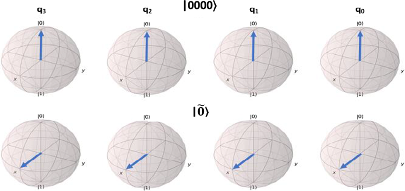 The upper row depicts Bloch spheres for the quantum state |0000⟩. The lower row shows the resultant state after applying QFT on |0000⟩, represented as \(\left|\widetilde{0}\right.\rangle \)