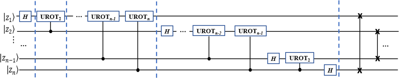 Exploring the QFT for an expanded state space, particularly where \(N={2}^{n}\), highlights its enhanced effectiveness. Applied to a quantum state \(\left|z\right.\rangle =\left|{z}_{1}\dots {z}_{n}\right.\rangle \) as the most significant bit, the utility of the QFT becomes increasingly apparent. The application of the QFT to \(\left|z\right.\rangle \) can be represented as follows: