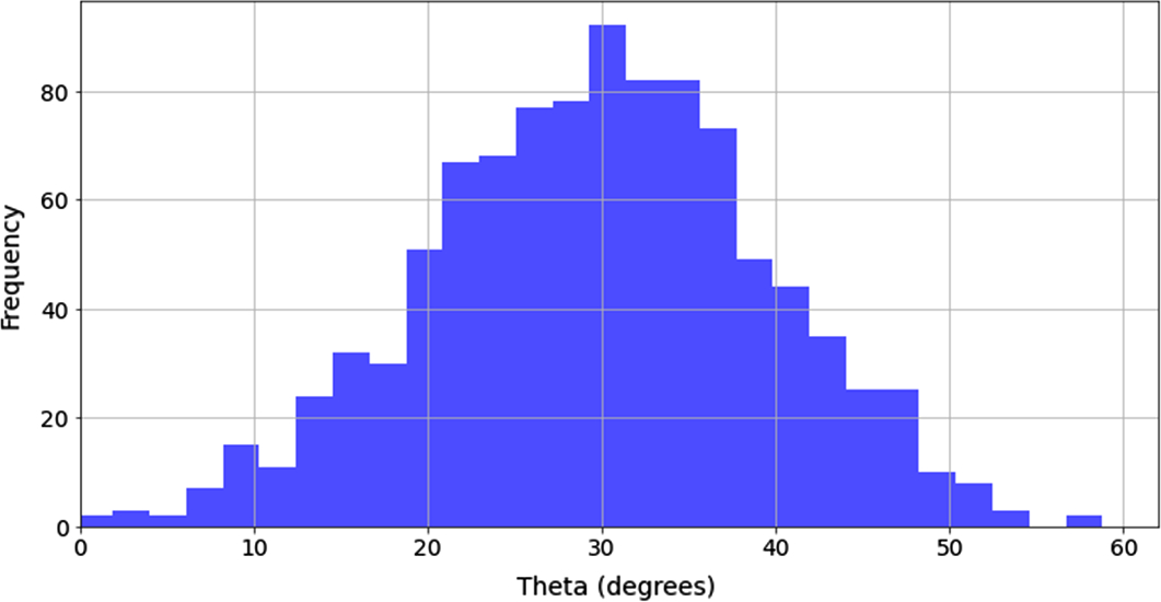 Histogram of θ values drawn from a Gaussian distribution (μ = 30°, σ = 10°)