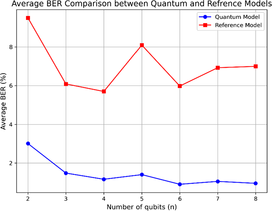 The quantum model maintains a significantly lower BER than the reference model across all qubit counts, demonstrating the superior performance of the QFT-IQFT process. The disparity between the 2 models remains substantial as the number of qubits increases. For instance, at 8 qubits, the quantum model achieves a BER of 0.8%, compared to 9.3% in the reference model.