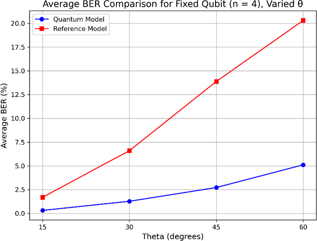 Average BER comparison between the quantum and reference models with a fixed qubit count (n = 4) and varied \(\theta \) values (15°, 30°, 45°, and 60°)