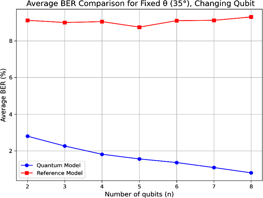 Figure 8 illustrates the average BER comparison between the quantum and reference models with a fixed θ (35°) and varying qubit counts from 2 to 8. This comparison demonstrates how the BER changes with increasing qubit counts, providing insights into the sensitivity of each model to qubit variations.