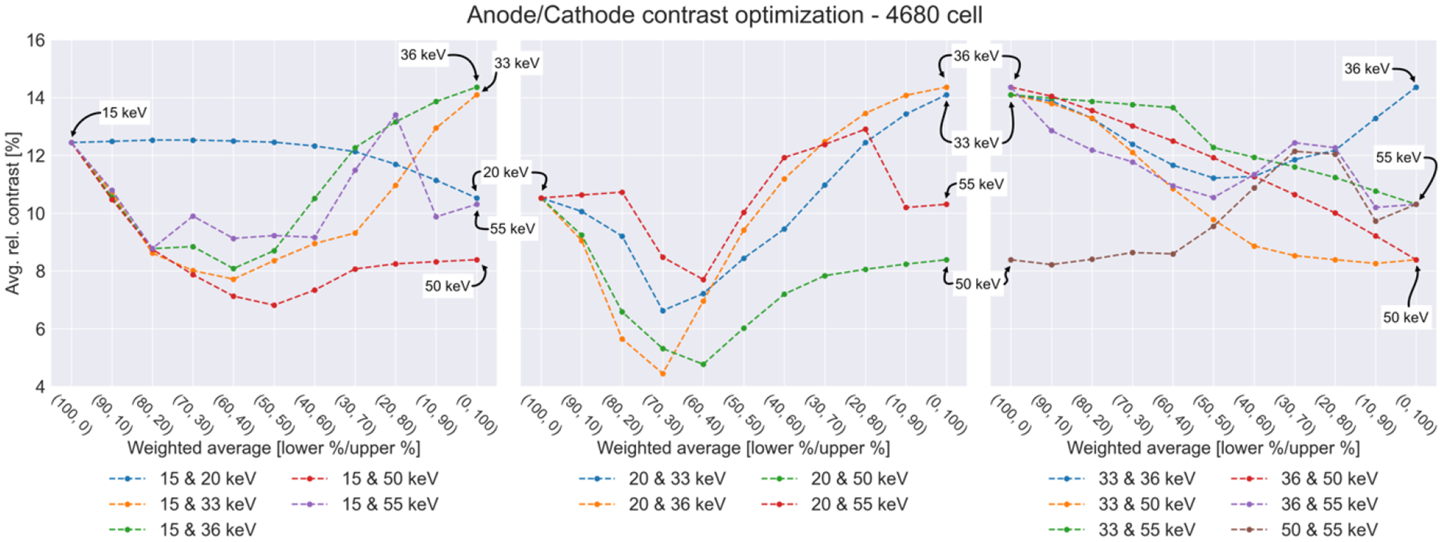For the 2170 cell (Fig. 11), the highest anode/cathode contrast was measured at a 70/30 ratio of 33 and 36 keV, closely followed by the case of 100% 36 keV data. The contrast was at a minimum when combining 36 and 55 keV data at a 40/60 ratio. Also using only a 20 keV threshold resulted in low contrast. The contrast curves for the 4680 cell (Fig. 12) show quite different trends, but the overall result is similar: Contrast is maximized when reconstructing with 100% 36 keV data. Lowest contrast for the 4680 cell is achieved with a 70/30 combination of 20 and 36 keV or a 60/40 combination of 20 and 50 keV. This highlights the benefits of threshold optimization when dealing with noise limited data. There may not be a benefit combining two noise-limited datasets.