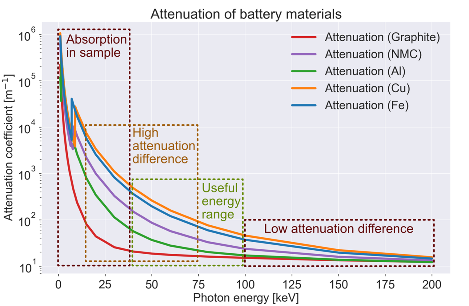 Attenuation coefficients of the materials in a battery for energies between 0 and 200 keV, showing a region with high absorption in the sample (0–40 keV), a region with high attenuation difference (15–75 keV), a region with low attenuation difference (100–200 keV), and the main energy range useful for imaging (40–100 keV)