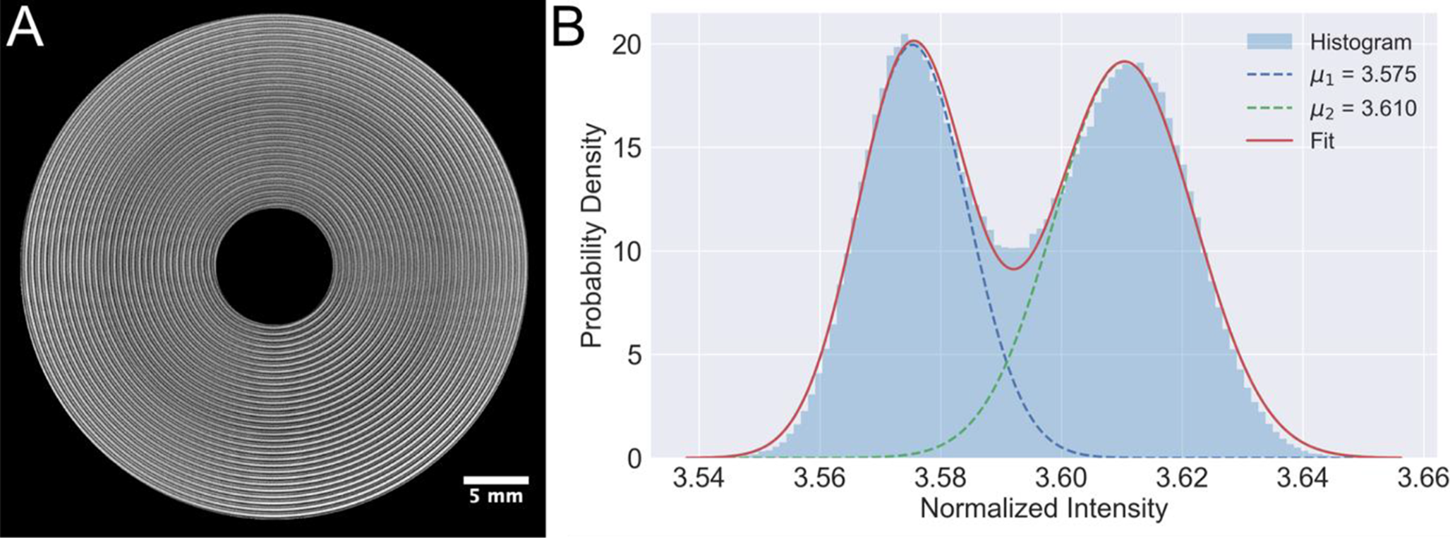 The first optimization method aims to characterize how the contrast-to-noise ratio (CNR) between the different features in the jelly roll changes as a function of the energy threshold. To select regions to compare, the histogram of gray values was used to assess the mean and standard deviation of the more attenuating (Cu and NMC) and less attenuating materials (Al and graphite). A thick annular ROI was drawn in the battery reconstruction so neither the battery housing nor core were included in the evaluation (Fig. 4A). The histogram of gray values in this ROI was fitted with a double gaussian to estimate the means (\(\:{\mu\:}_{i\:}\))and standard deviation (\(\:{\sigma\:}_{i\:}\)) for both material classes (Fig. 4B).