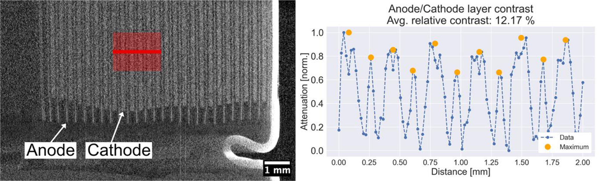 Left: Example of a vertical virtual slice through a 2170 battery from a 4s CT scan. The narrow anodes can be distinguished from the wider cathode layers. The red line indicated the position of the line profile shown in the right figure. Right: Intensity profile across 2 mm of the jelly roll, including 6 cathode layers and 5 anodes. Measured data is shown in blue and the position of the maximum intensity of the anodes and cathodes is shown by orange dots