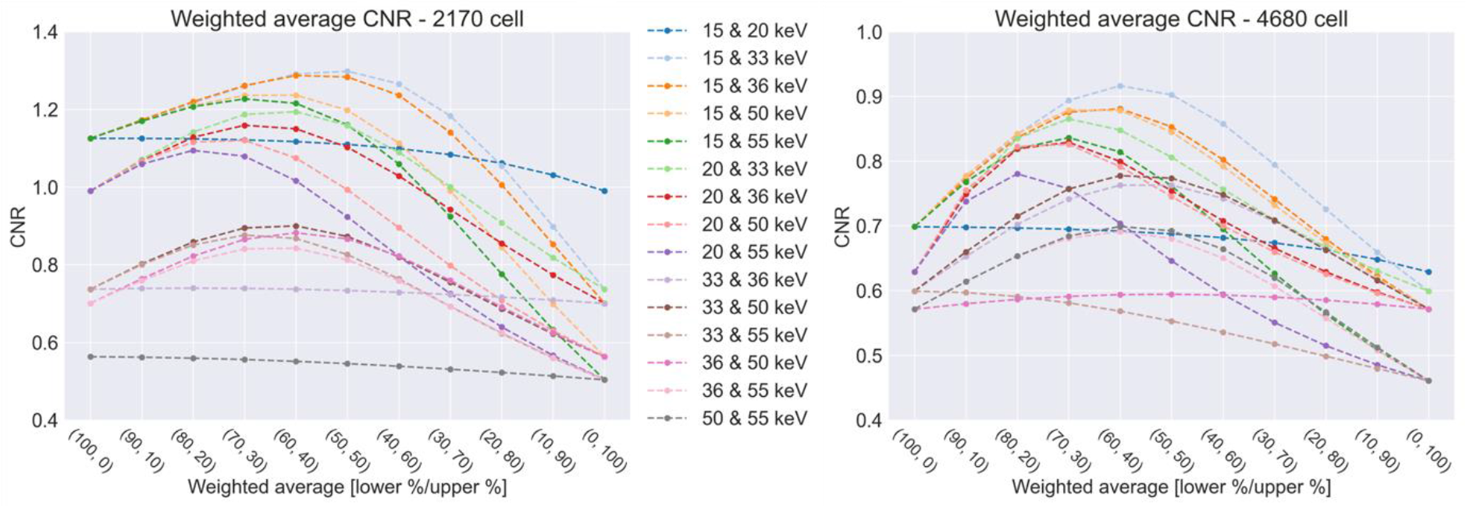 Contrast-to-noise ratio for the 2170 (left) and the 4680 cell (right) for different weighted average combinations of the chosen energy thresholds. The CNR is typically maximized when combining data from two different thresholds. The exceptions seem to be combinations of two low, two medium or two high-threshold datasets