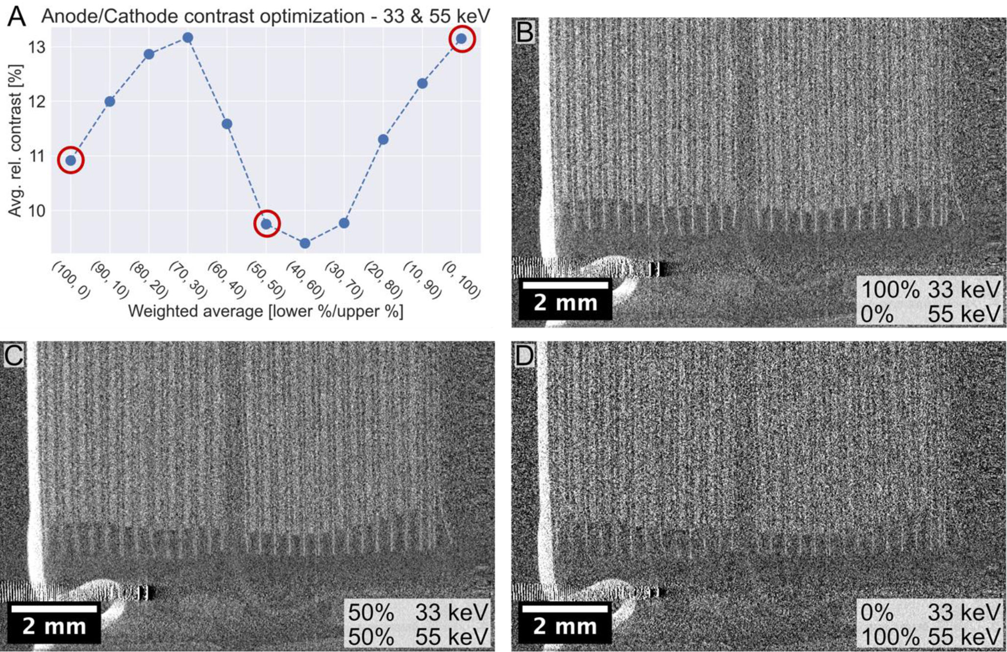 Weighted average results composed of varying parts of the 33 and 55 keV threshold images of a 2170 battery. (A) Average relative contrast between anode and cathode for different weights of the two different thresholds. Examples of single slice CT data from datasets composed of (B) 100% 33 keV and 0% 55 keV, (C) 50% 33 keV and 50% 55 keV, and (D) 0% 33 keV and 100% 55 keV