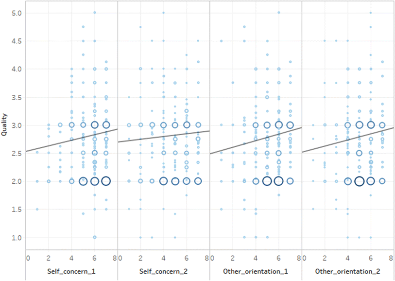 Although descriptive data visualizations suggest a positive correlation between all four items of self-concern and other-orientation and the quality of reports (Fig. 1), no evidence for a statistically significant relationship (p > 0.05) was found by running a linear regression model. Interrater reliability between the five coders was sufficient with an intraclass correlation coefficient (ICC) of 0.58 according to Koo and Li (2016).