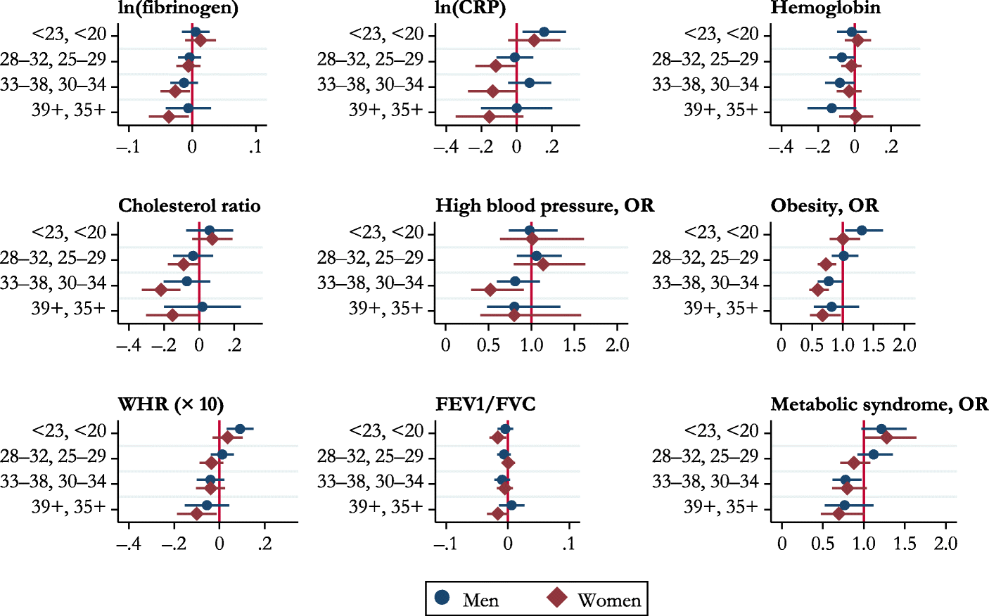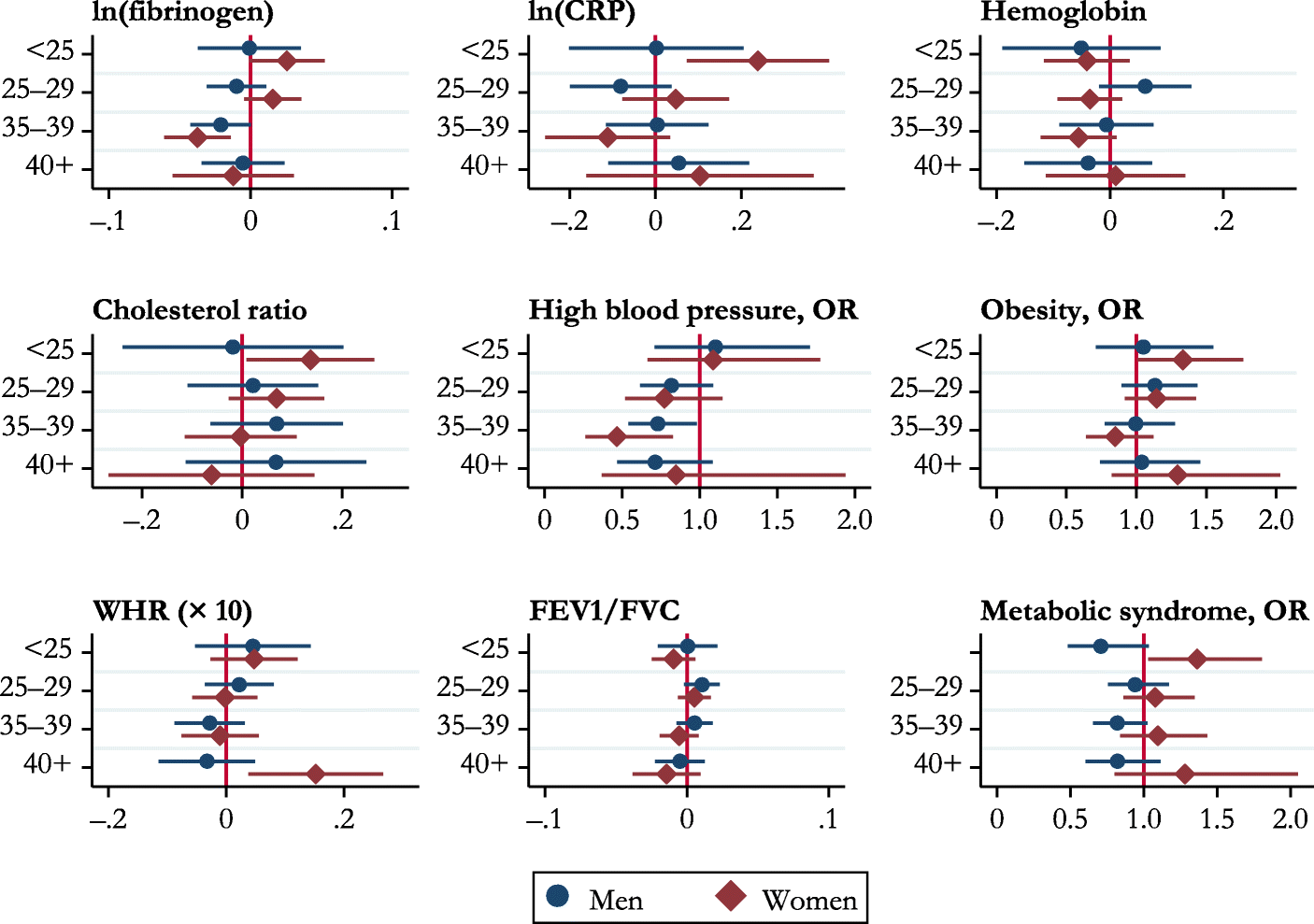 To explore differences that may arise using biomarkers rather than self-reported measures, we estimated models using self-rated health at the time of biomedical sweep as the outcome (see the online appendix for results). For women, associations among number of children, age at first/last birth, and poor or fair self-rated health were broadly consistent with those observed using biomarkers. Among men, however, there were some differences. For example, age at entry to fatherhood was associated with hemoglobin, obesity, and metabolic syndrome but not with fair/poor self-rated health. This may indicate that some men are not aware of, or are unwilling to report, conditions associated with poorer health outcomes and perhaps do not consider being overweight or obese as indicative of health status. This is something that merits further investigation.