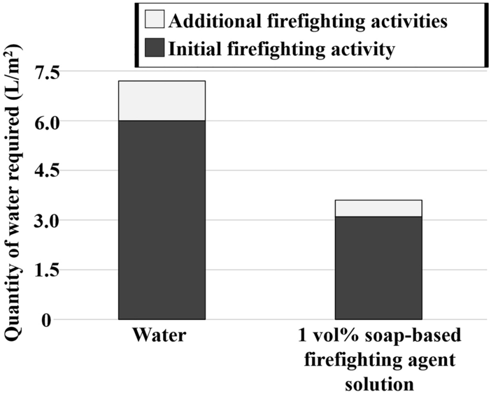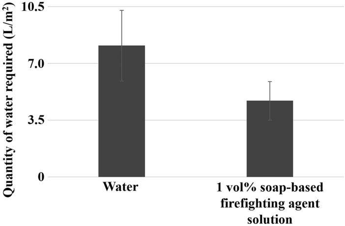 Quantity of water required to extinguish the fire in meso- and large-scale fire extinguishing experiments. The quantity of 1 vol% soap-based firefighting agent solution required for firefighting in the meso and large-scale fire extinguishing experiments was 4.7 and 3.6 L/m2, respectively; whereas 8.1 and 7.2 L/m2 were required for the water only treatment. The 1 vol% soap-based firefighting agent solution therefore halved the total quantity of required water for firefighting
