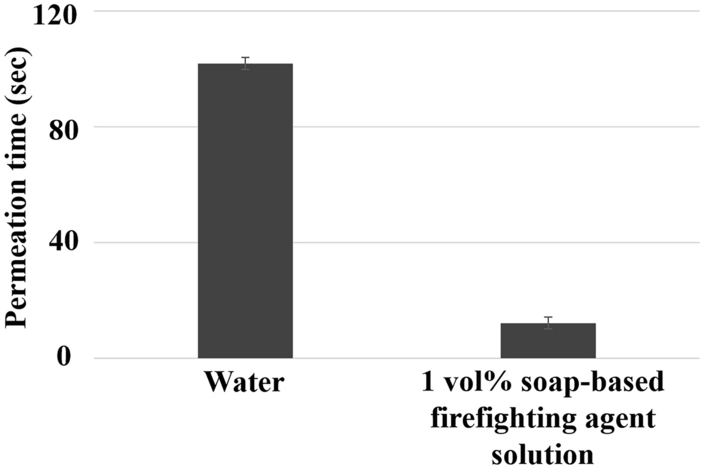 Permeability difference between water and the 1 vol% soap-based firefighting agent solution into peat soil. Here, we dropped 200 µL of water or 1 vol% soap-based firefighting agent solution on the surface of approximately 60 g of peat soil and the permeation time was visually measured