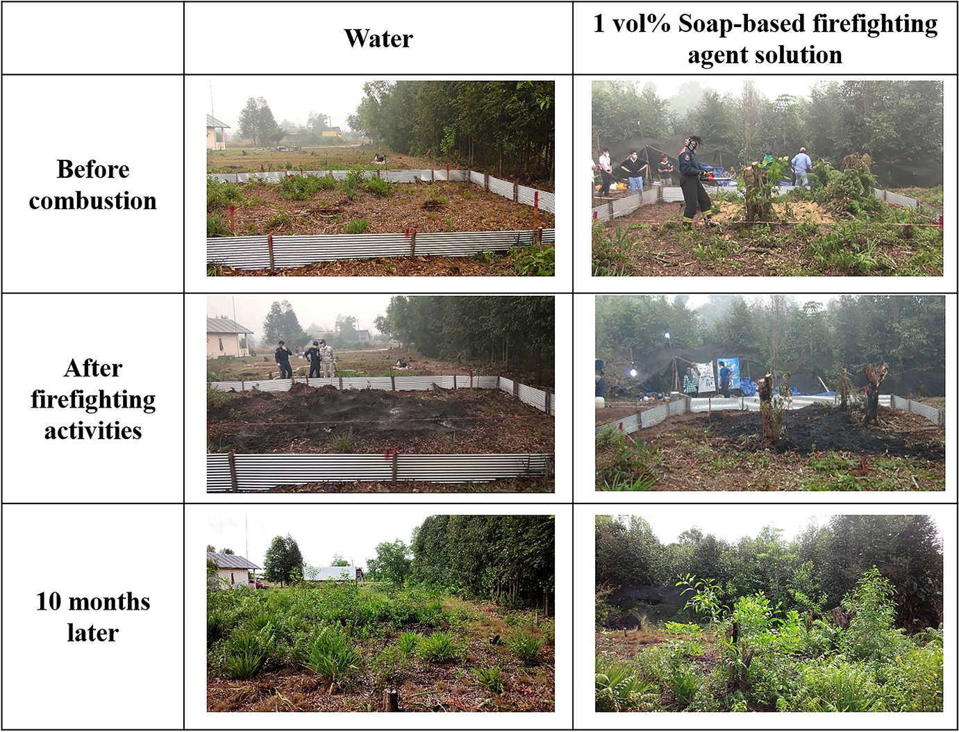 We conducted meso-scale and large-scale peat fire extinguishing experiments with the University of Palangkaraya to verify the effectiveness of the soap-based firefighting agent. In the meso-scale experiments, we investigated the spread of peat fires and quantity of water required to extinguish the fire. In the large-scale experiments, we carried out practical firefighting activities and verified the effectiveness of the soap-based firefighting agent compared with water treatment. We also confirmed the low eco-toxicity of the soap-based firefighting agent by observing the natural regeneration of the vegetation over a 10 months period.