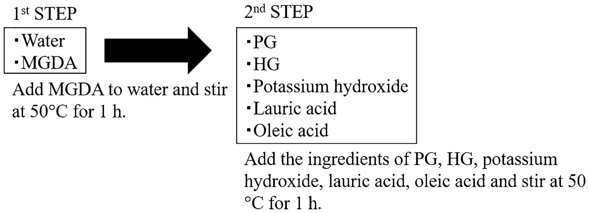 Lauric acid and oleic acid were purchased from Cognis Oleochemicals Co., Ltd., Malaysia, and Miyoshi Oil & Fat Co., Ltd., Japan, to prepare potassium laurate and potassium oleate. Methylglycine diacetic acid (MGDA, manufactured by BASF, Germany) was used as the chelating agent. Water, propylene glycol (PG), and hexylene glycol (HG) were used as diluents.