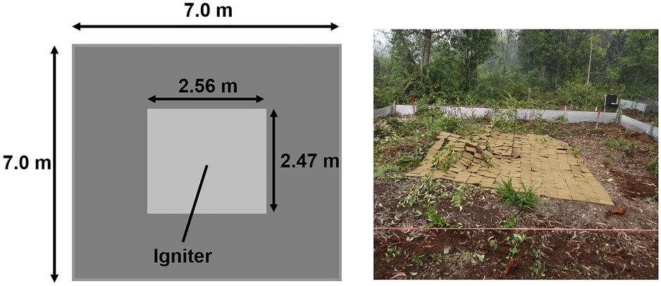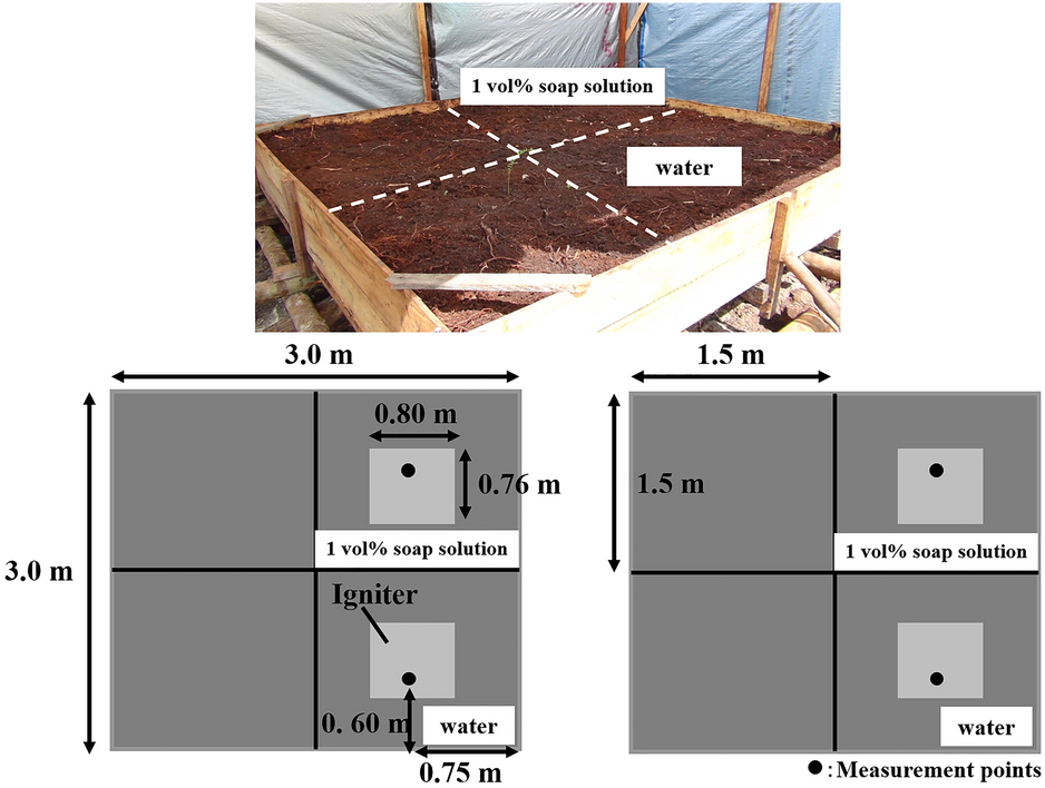 In the meso-scale experiments, we used 28 igniters in 1.5 m × 1.5 m plots (12 igniters/m2). In the large-scale experiments, there is a possibility that more combustion will occur than in the meso-scale experiments, thus we reduced the number of the igniters to 9 igniters/m2. We set the fire extinguishing temperature for initial firefighting at 100°C in the meso-scale experiments, but because we confirmed re-ignitions, we set the temperature to an even lower temperature of 50°C in the large-scale experiments.