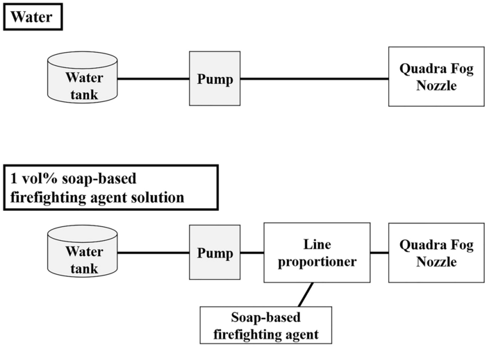 Fire extinguishing method in the large-scale fire extinguishing experiments. We transported water in the water tank with a pump, and sprayed water or the 1 vol% soap-based firefighting agent solution from the nozzle. We mixed the soap-based firefighting agent with a 1 vol% solution with a line proportioner