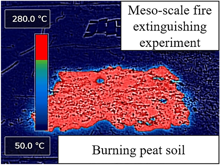 The meso-scale fire extinguishing experiments were conducted to determine the following three experimental conditions for the large-scale fire extinguishing experiments: how to burn peat soil, initial water-spray density, and the standard ground surface temperature to assess the fire extinguishing approach.