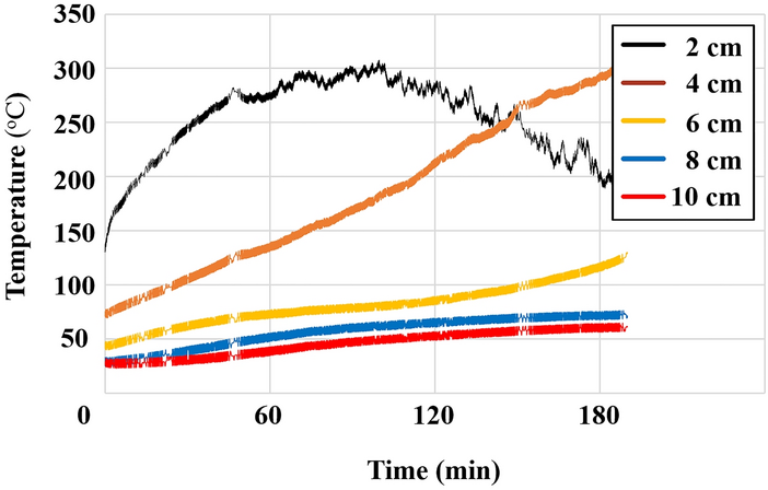 The peat surface temperature of the burning peat soil reached > 280°C, as shown in Fig. 6, 40 min after the start of combustion. The underground temperature of the burning peat soil is shown in Fig. 7. The underground temperature of the burning peat soil reached approximately 300°C. After 80 min from the start of the temperature measurement, the temperature reached 300°C at a depth of 2 cm; after 180 min, the temperature reached 300°C at a depth of 4 cm.