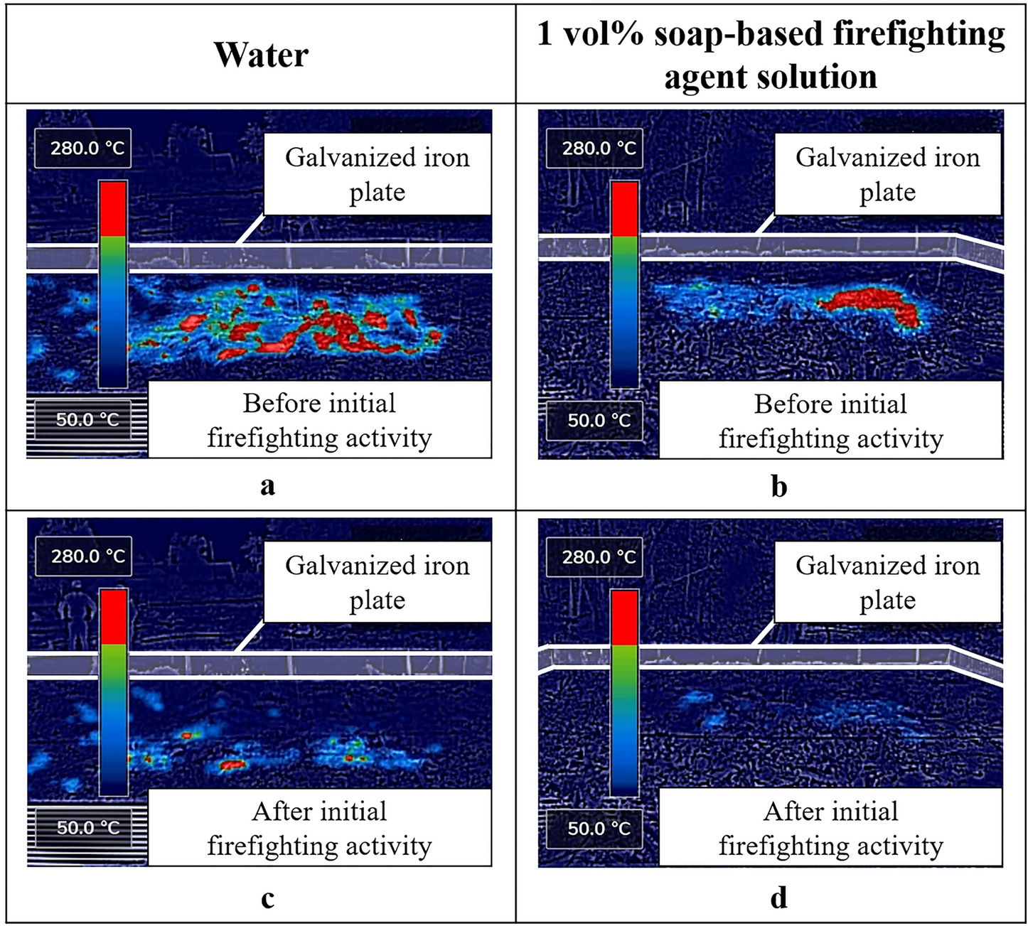 we observed many areas of hot spots as high as 150°C in water treatment (c), whereas there were almost hot spots < 70°C accounted for the majority in the 1 vol% soap-based firefighting agent solution (d)