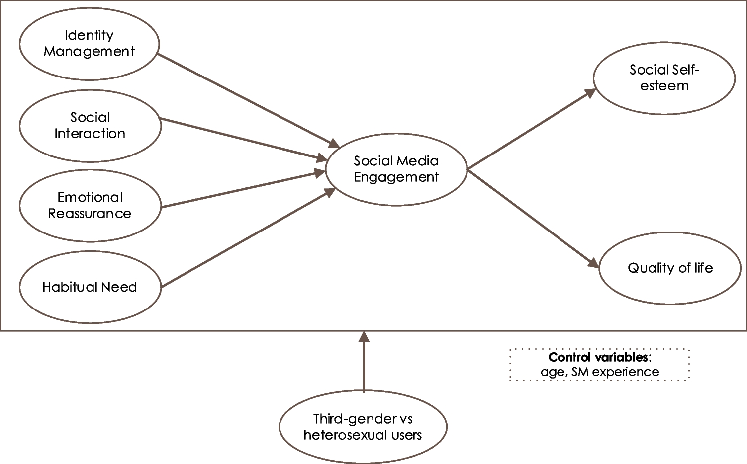 UGT is a comprehensive theory answering why people use media and what media offer to people. Specific to social media, different individual-level outcomes have been reported (Kapoor et al., 2018), including personal performance (Dhir et al., 2019), life satisfaction (Ponnusamy et al., 2020), and quality of life (Krishnan & Zhou, 2019). “However, it is unclear whether psychological dependency on social media and social media use behaviour have beneficial offline effects” (Han et al., 2019, p. 91). Nonetheless, Cannon et al. (2017) recommend that “social media represents a phenomenon that may have an empowering impact on LGBT communities” (p. 71–72). Based on extant studies, we investigate two higher-level outcomes of SMEn, including social self-esteem and quality of life.