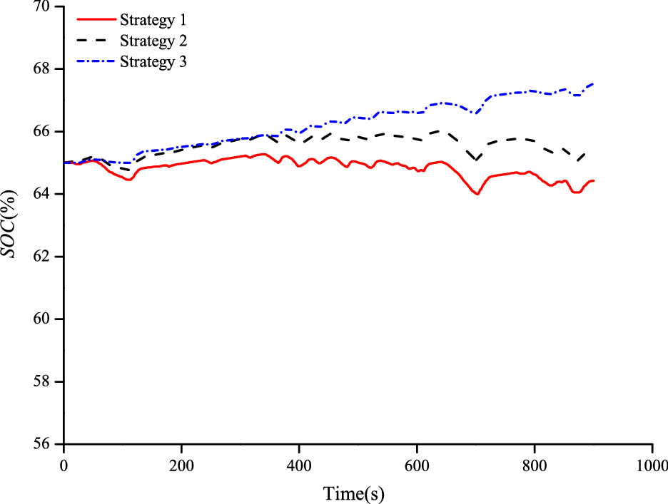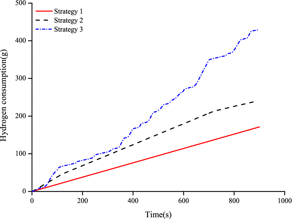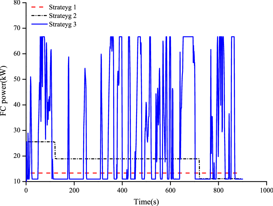 According to the economic calculation results, the calculated hydrogen consumption per 100 km in Strategy III is the highest (Table 3). As shown in Fig. 11, the frequency of fuel cell power change in energy management Strategy III is relatively higher, which has a great impact on the service life of the fuel cell system. And the hydrogen consumption in Strategy I is the lowest because stationary operation with the average load leads to the minimum fuel consumption according to Fig. 11. It is consistent with Deng's paper in which the fuel consumption of the fuel cell is a slightly parabolic shape [22].