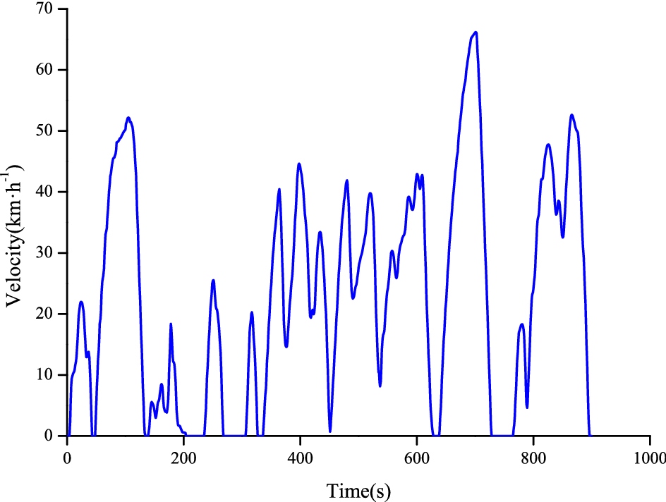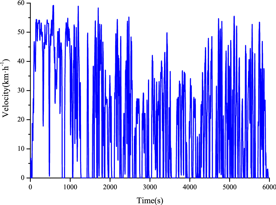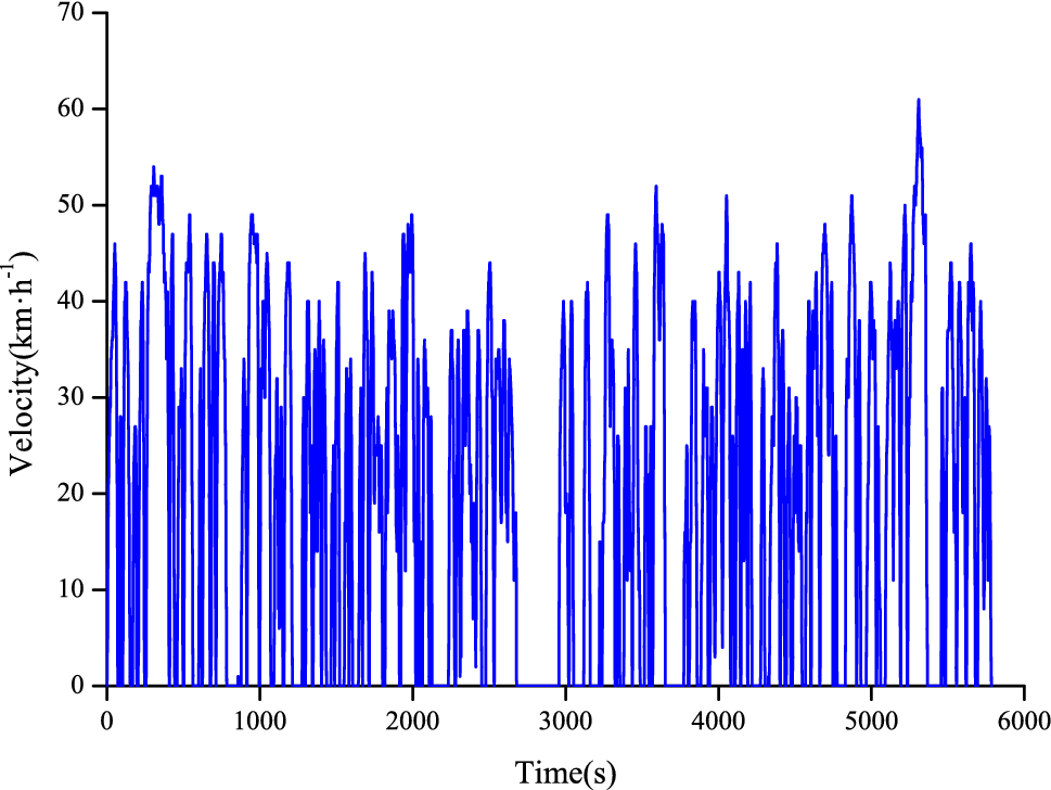 The vehicle velocity and the battery SOC are shown in Figs. 16 and 17, respectively. Through the analysis of the collected data, the vehicle traveling distance was 31.5 km. When the half-power prediction control strategy is adopted in this working condition, the range of battery change of the SOC was about 4.4%, the fuel economy of the vehicle was 3.7 kg/100 km, and the cycle time of the battery per 100 km was 0.76. Compared with the stepped control strategy of the SOC, the hydrogen consumption per 100 km was reduced by 7.1%, and the cycle time of the battery was lowered by 6.0%. Configured with 35 MPa hydrogen system, the driving range of the vehicle could reach 670 km, and 1100 km with 70 MPa hydrogen system.
