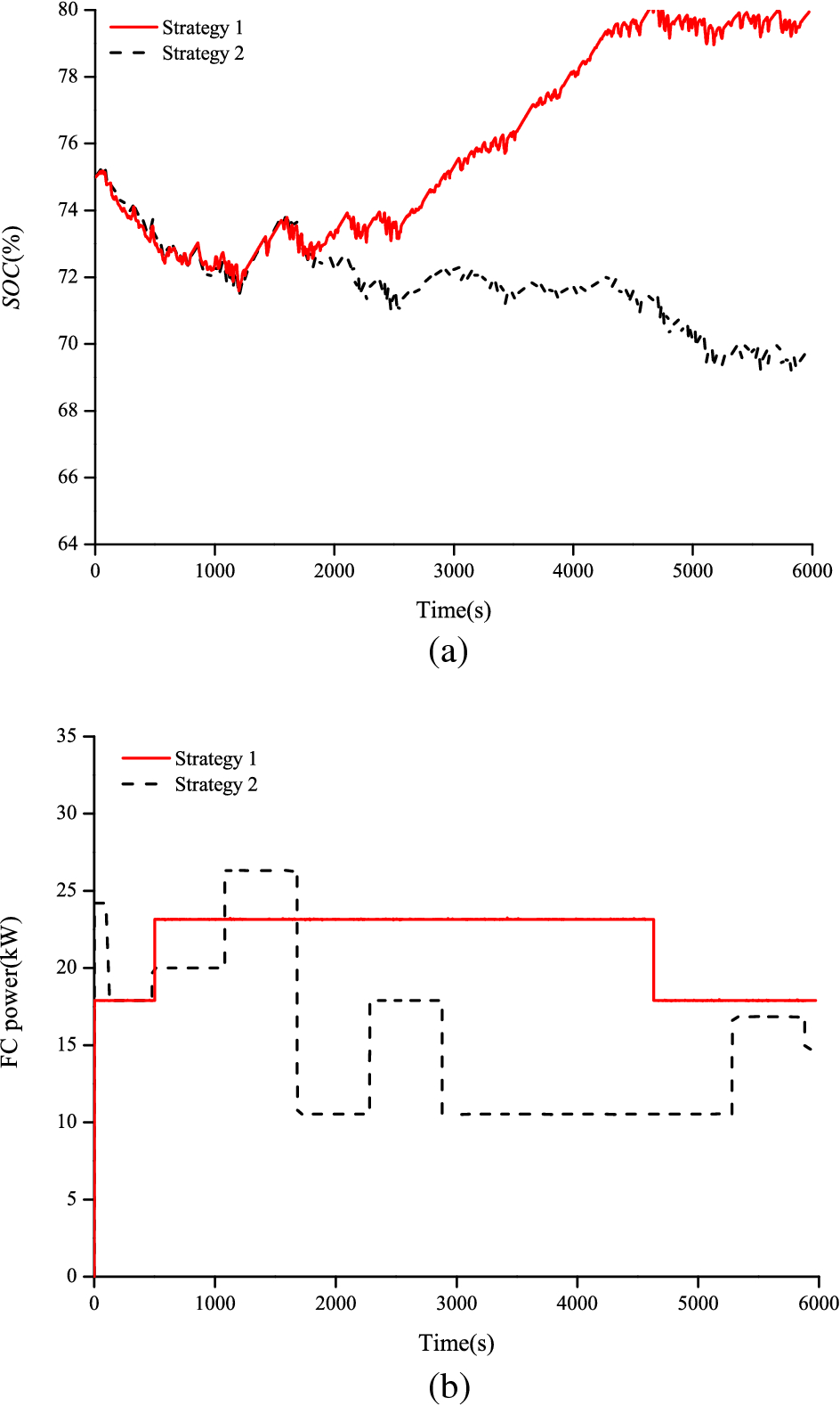 The efficiencies of fuel cell system in Strategy I and Strategy II are relatively close, and cycle times for the batteries are also similar. Moreover, the fuel economy and battery lifetime of the two strategies are comparable. At the same time, the direct energy utilization rate of the fuel cell in Strategy II is relatively high. According to the calculation results, the hydrogen consumption in Strategy I and Strategy II is comparatively similar (Table 3), but Strategy I not only requires predicting the operating condition of the vehicle in advance or collecting a mass of working condition analyses for parameter calibration, but also boasts stringent experience requirements for technical personnel. By contrast, Strategy II is more adaptable to the working condition, and the target power of fuel cell system can be calculated based on the operating condition. Figure 12 shows that the SOC variation range in Strategy II is more stable than that in Strategy I. Therefore, control Strategy II is selected on the basis of the analysis results and practical applications.