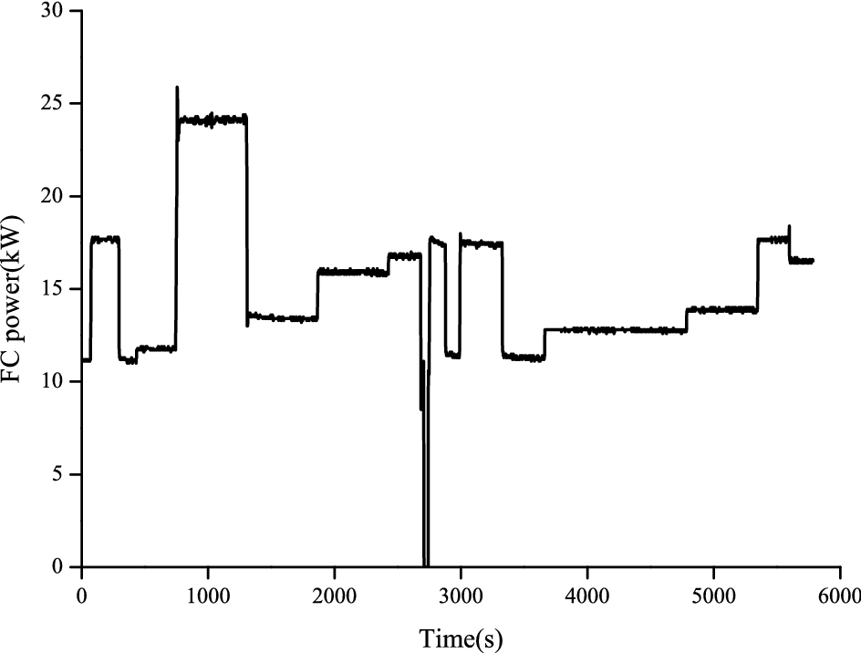 In the half-power prediction control strategy, fuel cell target power can be calculated based on the vehicle demand in the past period of time, which is reasonably close to the current operating condition of the vehicle. Thus, it has strong adaptability to operating conditions. Unlike the stepped control strategy of the SOC, the control strategy does not require calibration of the fuel cell output power and can adapt to a variety of operating conditions, such as different velocities and passenger flow of line vehicles in different cities, and the required power of the vehicle varies. It can also avoid the frequent switching of fuel cell system as the fuel cell output power is greater than the required power of the vehicle, leading to the increase in the hydrogen consumption or the excessive rise of the SOC of the battery, which affect the fuel cell system lifetime. With the improvement of the fuel cell system performance in the future, the cycle of calculating fuel cell target power can be gradually shortened in the energy management strategy so as to further meet the required power of the vehicle.