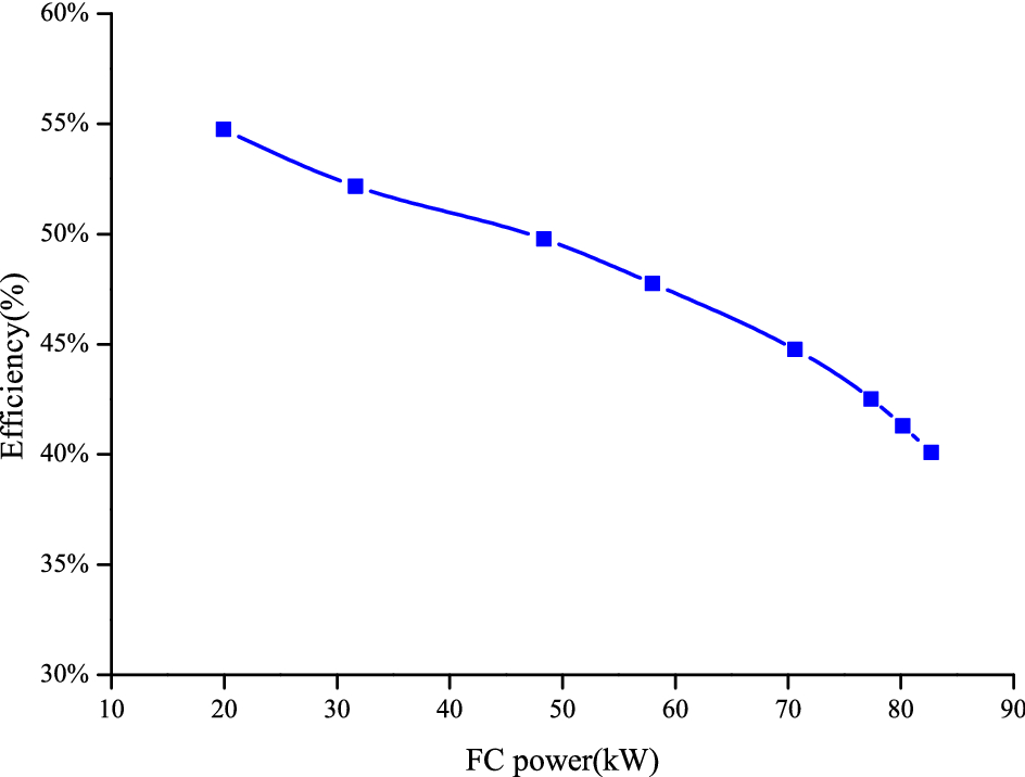 When employing the half-power prediction control strategy, the power output of the fuel cell system is lower than 30 kW as shown in Fig. 18 which demonstrates that the fuel cell system lies within industry accepted efficiency ( greater than 50% as shown in Fig. 19). And the range variation of the SOC is approximately 4.4% and slowly moves to a stable level, as seen in Fig. 17. As a comparison, the fuel cell outputs higher power, its system efficiency is lower, and the range variation of battery of the SOC is greater at 16.0% while adopting the stepped control strategy. Thus, its working condition adaptability is not promising. The above test results are consistent with the simulation data.