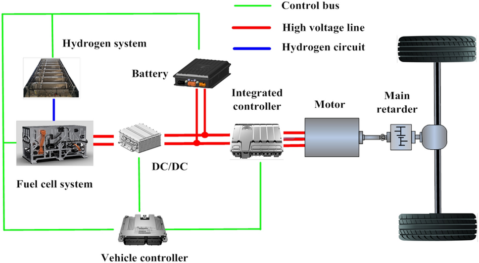 Fuel cell vehicles [1‐4] are one of the most important technical routes for new energy vehicles because of their zero-emission, long cycle life, and high operating convenience. In order to realize “Green Olympics,” hydrogen fuel cell vehicles are mainly used in the competition area of Zhangjiakou, Hebei Province, China, to reduce carbon emissions in the 2022 Beijing Winter Olympics. The inherent characteristics of fuel cells such as the inability to recover regenerative braking energy, poor reliability, slow dynamic performance response, and high cost [5‐8] are undesirable. These undesirable characteristics can be compensated by batteries even though the driving range is relatively short. Consequently, the hybrid power system technology consisting of fuel cell and battery is becoming a new direction for the development of fuel cell vehicles [9]. The current power system structure for fuel cell vehicles mainly includes: (1) fuel cell and battery, (2) fuel cell and supercapacitor, and (3) fuel cell, battery, and supercapacitor [10, 11]. For the hybrid power system of fuel cell and battery, if the power output from the fuel cell of the vehicle is too high during power distribution, operating it in the overload state leads to a higher economic cost. Consequently, the performance of the fuel cell system will gradually decline. If the power output from the battery is too high, the fuel cell system will be in a light-load state, affecting the overall performance of the vehicle. Therefore, a reasonable energy management strategy needs to be selected to allocate the output power of the fuel cell system and battery in accordance with the actual demand of the vehicle. And the energy management strategy is a crucial technology for improving fuel economy and has a significant impact on different parameters including the fuel cell system lifetime, battery lifetime, and fuel economy [12‐15]. Several researchers have studied energy management strategies for improving the performance of the drive system. For example, Gao et al. [16] developed an overall control strategy for the fuel cell-powered hybrid vehicle drive train, which enables the fuel cell system to meet the motor power requirements, maintain its power supply capability and allow the storage battery to allocate energy accordingly. Ahn et al. [17] proposed a fuzzy logic-based power control strategy for a fuel cell hybrid electric vehicle to improve fuel economy while maintaining the battery SOC. Li et al. [18] proposed an energy management strategy based on the T-S fuzzy method for fuel economy, and the results showed that the strategy outperformed the power-following control strategy in terms of overall system efficiency. Hu et al. [19] presented a real-time multi-objective optimization protocol for powertrain systems of a passenger car and showed that the power demand-based control method was more suitable for powertrain systems equipped with larger capacity batteries.