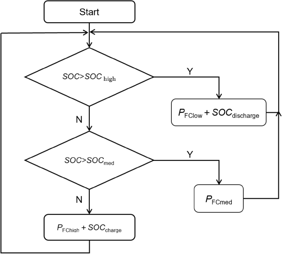 The third energy management strategy is the power-following control strategy. The power demands of the vehicle are calculated in real time based on vehicle operating conditions, which can then be considered as the target power of the fuel cell. This control method can significantly reduce the power throughput and charge/discharge rate of the battery. However, its response performance requirements for the fuel cell system are high, and the frequent in-vehicle urban driving cycles may damage the fuel cell membrane electrode set and affect the service life of the fuel cell system.