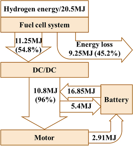During the test process, in the absence of air conditioning, the power consumption of the driving motor was 29.73 kW·h, the braking energy recovery was 13.86 kW·h, and the power consumed by accessories was 3.12 kW·h, among which the output power of the fuel cell system was 24.25 kW·h, the positive energy of battery was 22.41 kW·h, and the negative energy was 27.68 kW·h. The calculated breaking energy recovery accounted for 46.62%, and the direct energy utilization rate of fuel cell system is 31.76%.