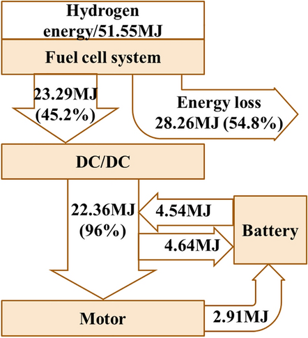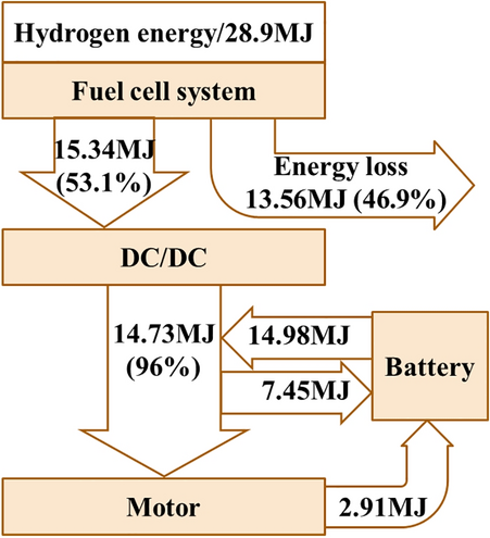 For the fuel cell city bus, more energy is recovered from breaking in operation condition, and the charging and discharging efficiency of battery is higher than 93%. Thus, the throughput of battery is allowed to be slightly higher so that the fuel cell system can operate in the high-efficiency range. Currently, the fuel cell system efficiency could be improved to reduce the hydrogen consumption of the vehicle.