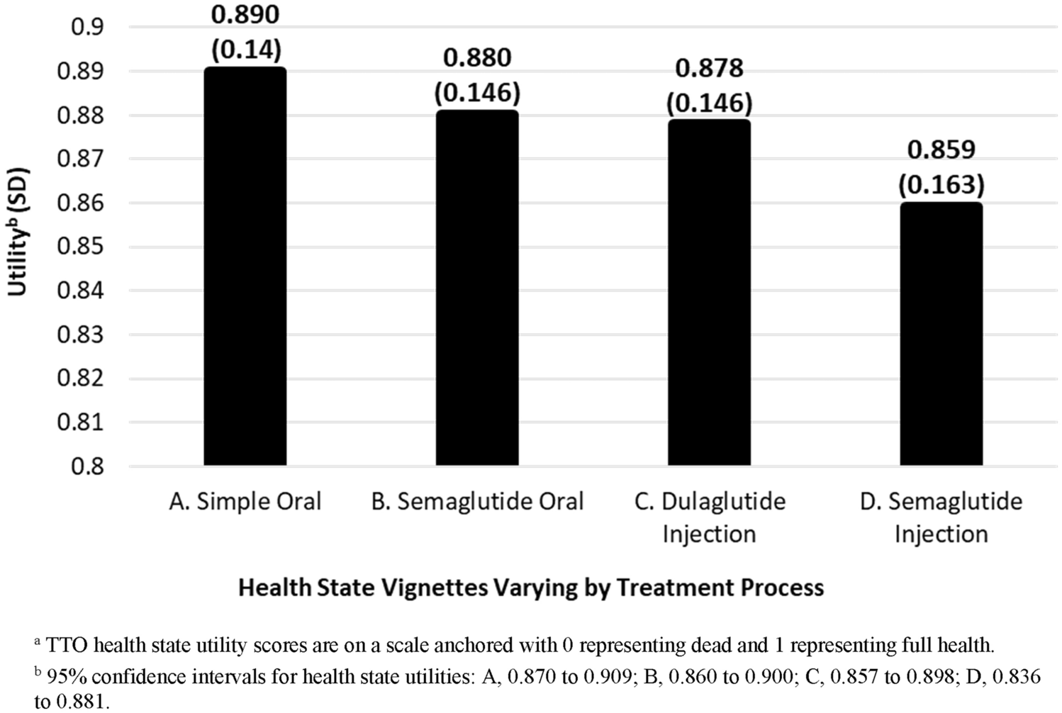 Interviews were completed by 201 participants (52.7% male; mean age = 58.7). Preferences between treatment processes varied widely. Mean utilities were 0.890 for simple oral, 0.880 for oral semaglutide, 0.878 for dulaglutide injection, and 0.859 for semaglutide injection (with higher scores indicating greater preference). All pairwise comparisons found statistically significant differences between utilities (p < 0.01), except the comparison between oral semaglutide and the dulaglutide injection (p = 0.49).
