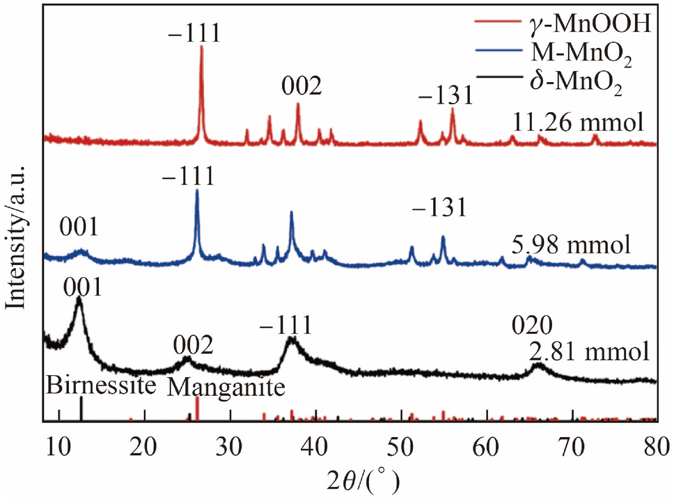 Figure 1 shows the X-ray diffraction (XRD) patterns of the as-synthesized samples. As 2.81 mmol (NH4)2C2O4 was added, all peaks of the sample could be indexed to the birnessite (JCPDS No. 80-1098); thereafter, it was named “δ-MnO2”. With the increase of (NH4)2C2O4 (5.98 mmol), the final product was a mixed phase (named “M-MnO2”) of δ-MnO2 and manganite γ-MnOOH (JCPDS No. 88-0649). After more reductants (11.26 mmol) were added, the birnessite phase disappeared, and there was only manganite; therefore, the sample was named “γ-MnOOH” [32, 33]. The wide peak widths of birnessite in δ-MnO2 and M-MnO2 indicate poor crystallinity, which may be caused by the damage to the ordered structure.