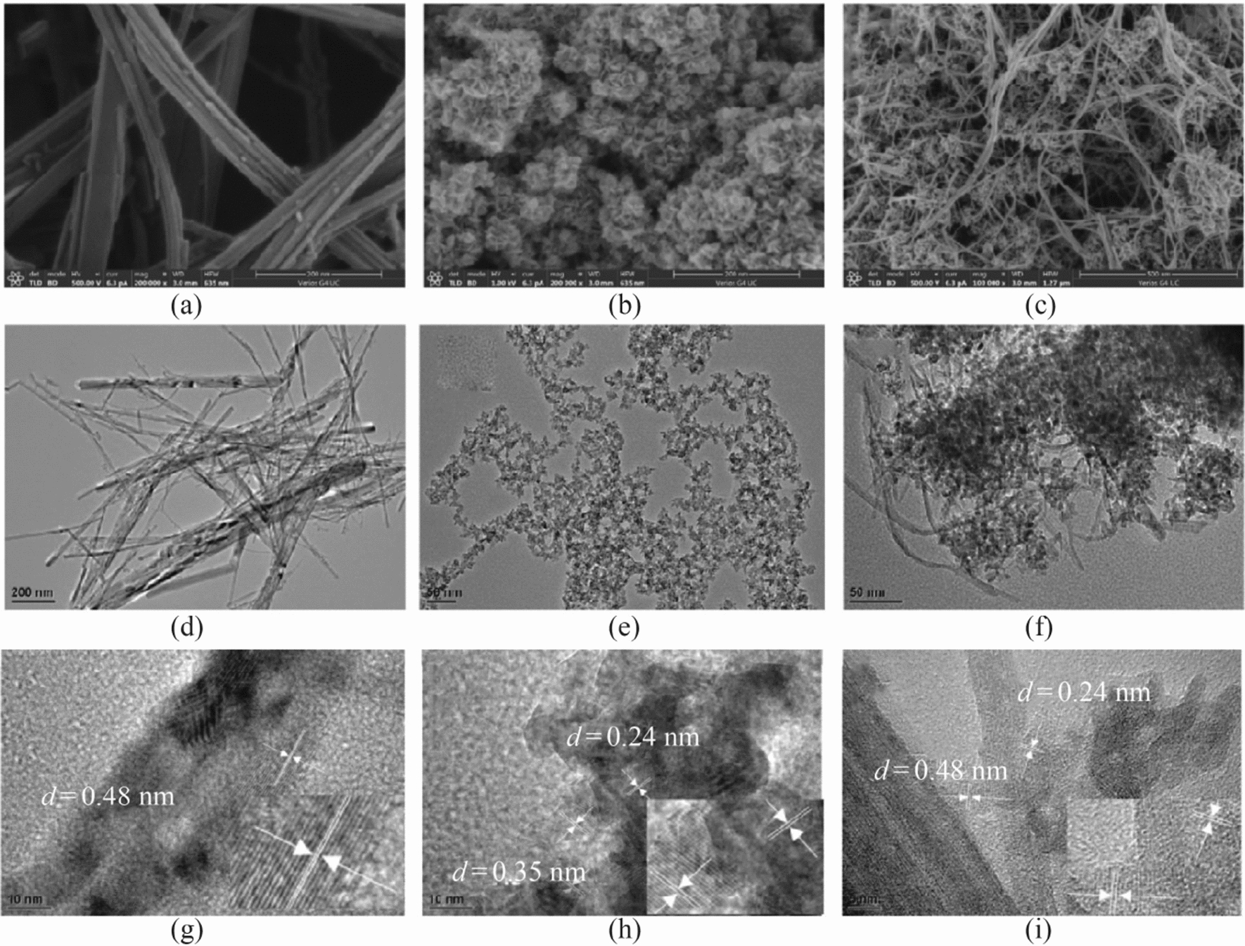The morphology and microstructure of these three samples were observed using SEM and TEM, as shown in Fig. 2. The morphology of γ-MnOOH nanowires can be observed clearly in Figs. 2a, d, and g, and the nanowires are randomly intertwined. The particles reveal a nanorod like morphology with a width of less than 50 nm and a length of approximately 1 μm, and the lattice fringes of 0.48 nm can be assigned to the (100) planes. The particles shown in Figs. 2b, e, and h are δ-MnO2. Figure 2b shows a flowerlike structure comprising nanoparticles, and the size of the nanoparticles observed in Fig. 2h is approximately 5–10 nm. The distances between the adjacent lattice fringes are 0.24 nm and 0.35 nm, which are related to the (−111) and (002) planes, respectively. However, the particles of the flowerlike structure in Fig. 2b show severe agglomeration. As shown in Figs. 2c, f, and i, M-MnO2 shows a special interconnected network structure with the flowerlike δ-MnO2 anchored on the γ-MnOOH nanowires. The γ-MnOOH as a framework support plays an essential role in the network structure, and δ-MnO2 is dispersed on the framework. The distances between the adjacent lattice fringes of M-MnO2 were 0.24 nm and 0.48 nm for δ-MnO2 and γ-MnOOH, respectively. It was concluded that the sample with this special morphology was a mixture of δ-MnO2 and γ-MnOOH. This is also supported by the XRD results. The morphology of the as-synthesized products can be regulated by modulating the ratio of (NH4)2C2O4/KMnO4 during the hydrothermal process. With the increase of the ratio of (NH4)2C2O4/KMnO4, the low-valent manganese compound γ-MnOOH appeared. The δ-MnO2 nanosheets tended to anchor on a nanowire-shaped γ-MnOOH, which increased the specific surface area and the pore volume compared with the pure δ-MnO2, as shown in Table 1.