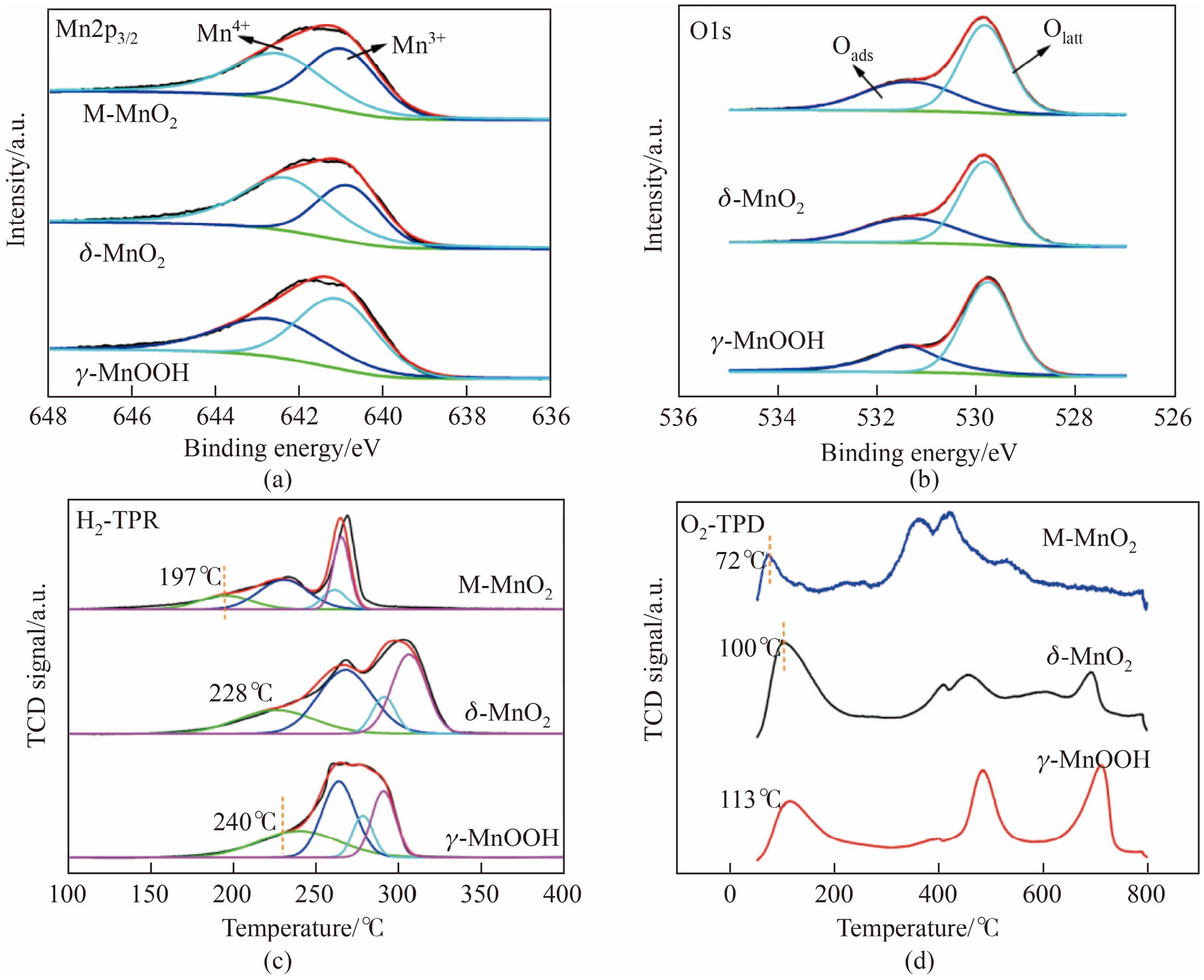 a Mn 2p and b O 1s XPS spectra of γ-MnOOH, δ-MnO2 and M-MnO2, c H2-TPR and d O2-TPD of the γ-MnOOH, δ-MnO2 and M-MnO2