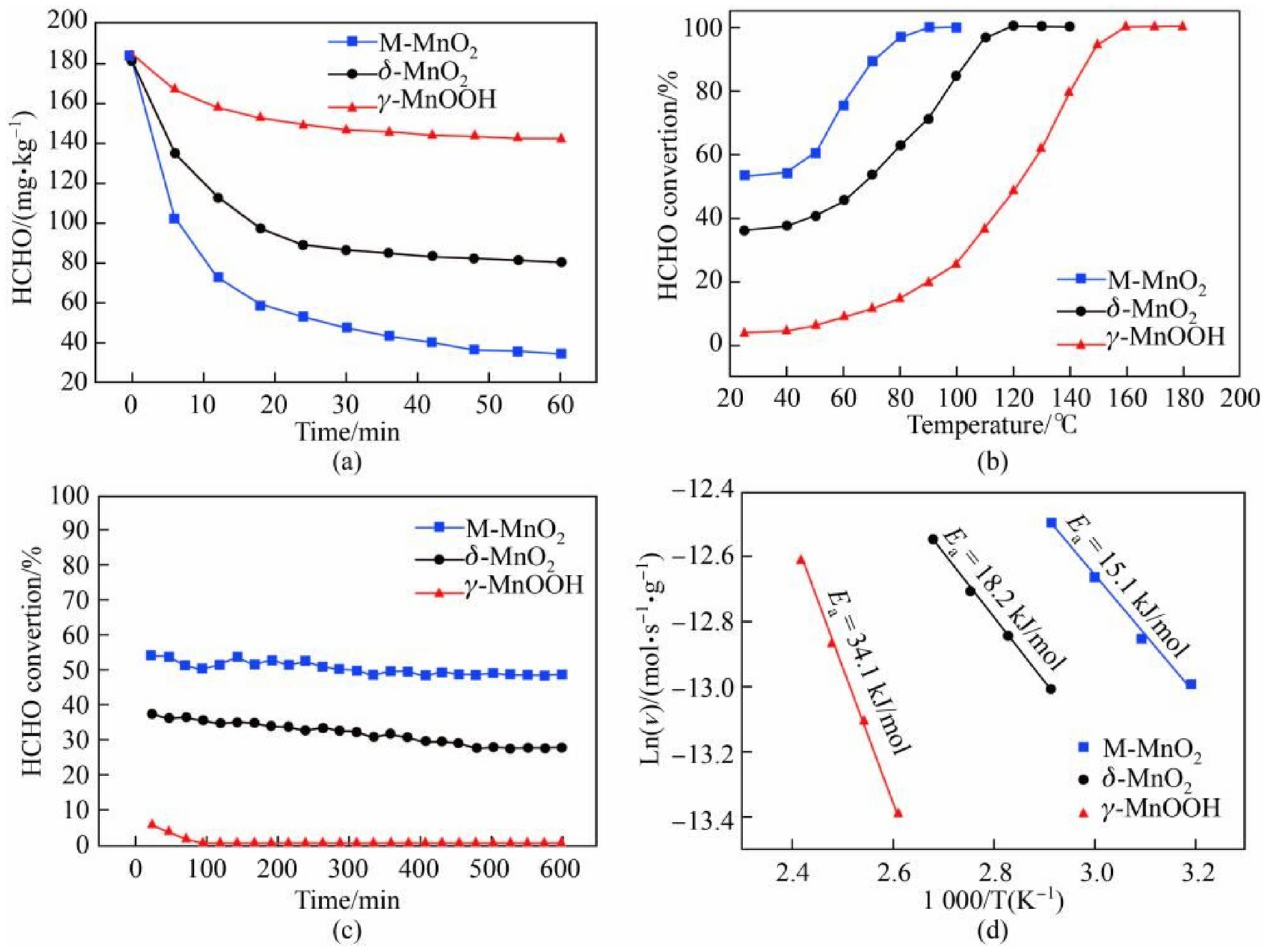 a Changes in the HCHO concentration with the catalytic time at room temperature in the static experiments, b HCHO conversion with the rise of temperature over the different MnO2 catalysts in the dynamic experiments, c stability test of the different MnO2 catalysts at room temperature in the dynamic experiments and d Arrhenius plots for HCHO oxidation for the different MnO2 catalysts