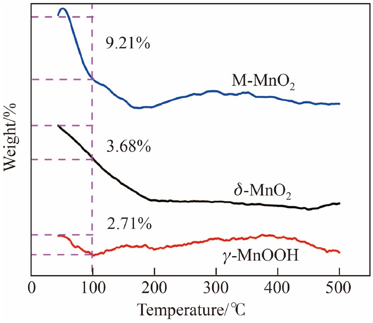Thermogravimetry (TG) analysis was used for evaluating the weight loss and qualitative analysis for detachable species in different samples with increasing temperature (see Fig. 5). Mass spectral analysis was used to confirm the detachable species according to mass charge ratio (m/z). It was found that the m/z of all detachable species was close to 18, which was consistent with the water molecule. The content of the largest surface adsorbed water loss (less than 100 °C) was 9.21% for M-MnO2, followed by δ-MnO2 and γ-MnOOH, which were only 3.68% and 2.71%, respectively. According to the literature, the surface adsorbed water can provide a rich surface hydroxyl group, which promotes the efficiency of HCHO oxidation at room temperature [17].