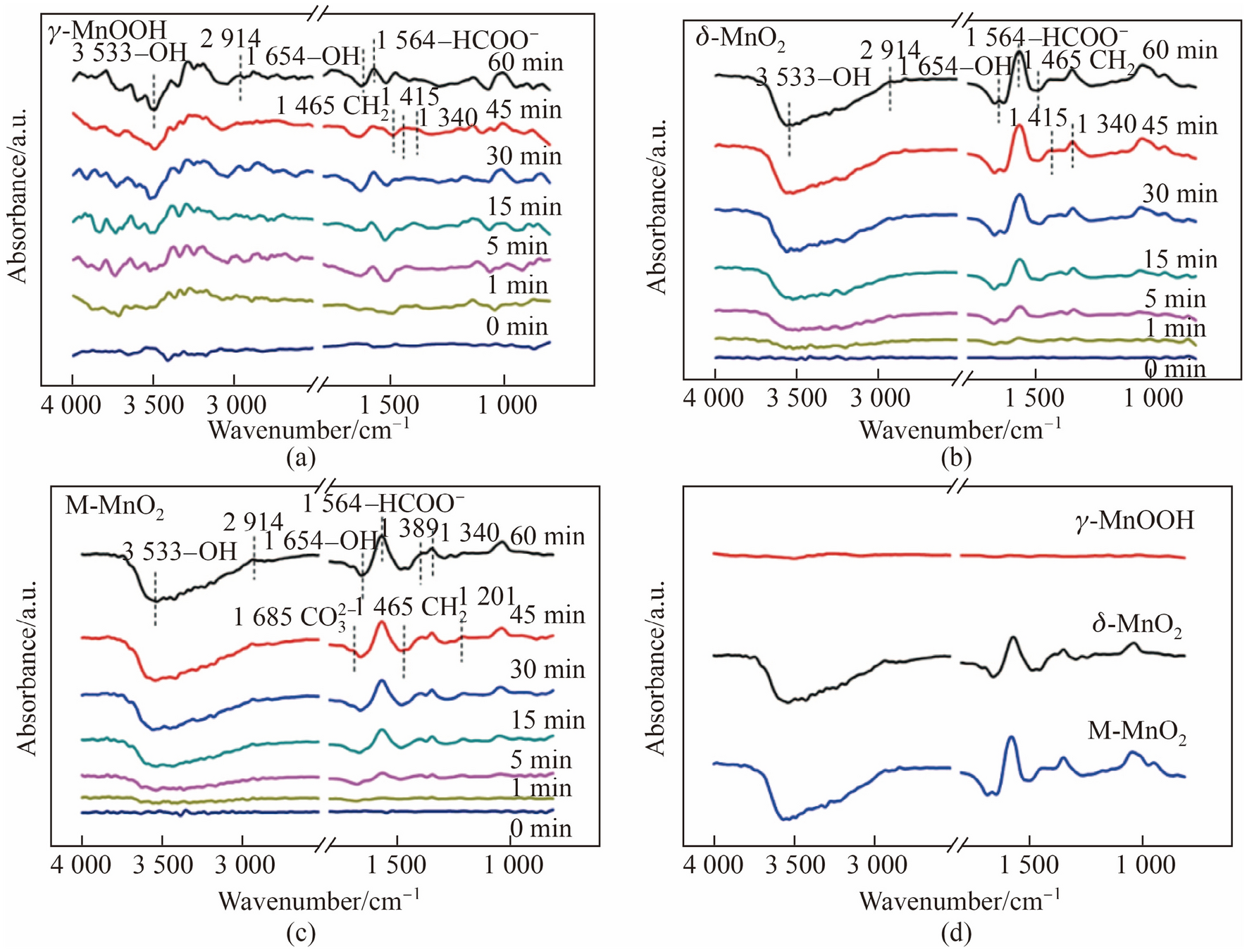 In-situ DRIFTS spectra of aγ-MnOOH, b δ-MnO2, c M-MnO2 exposed to a flow of 80 mg/kg of HCHO/N2 + 20% O2/N2 at room temperature and d high resolution of in-situ DRIFTS spectra of a–c at 60 min