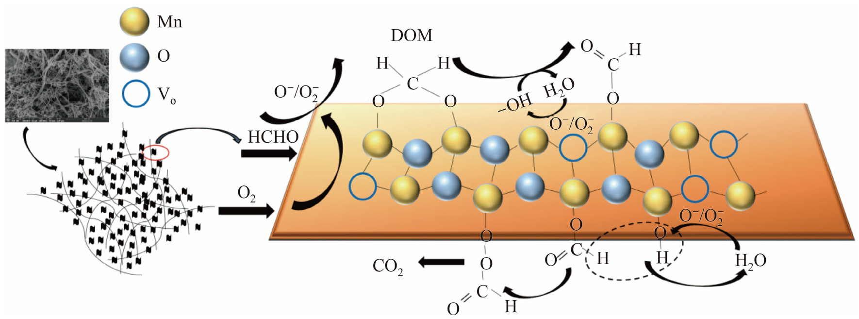 Based on the previous analysis, the mechanism of HCHO oxidation over M-MnO2 at room temperature can be described as shown in Fig. 7. Normally, HCHO is oxidized by active oxygen (·O−/·O2−) into DOM and formate species after adsorbing on the catalyst surface, while the formate species tend to deposit on the catalyst surface, which requires more energy or surface hydroxyl groups to decompose. However, M-MnO2 is composed of δ-MnO2 nanosheets dispersed on γ-MnOOH nanowires, and this structure can be beneficial for the surface active oxygen compared with δ-MnO2. According to the above-described experiments, the enhanced performance results from the special interconnected network structure, the dispersion and specific surface area of M-MnO2 are clear. This special morphology can provide more surface active oxygen species, more surface adsorbed water, and thus, higher surface hydroxyl groups. Therefore, the formate species can be rapidly transformed to carbonate species and then decomposed to CO2 and H2O.