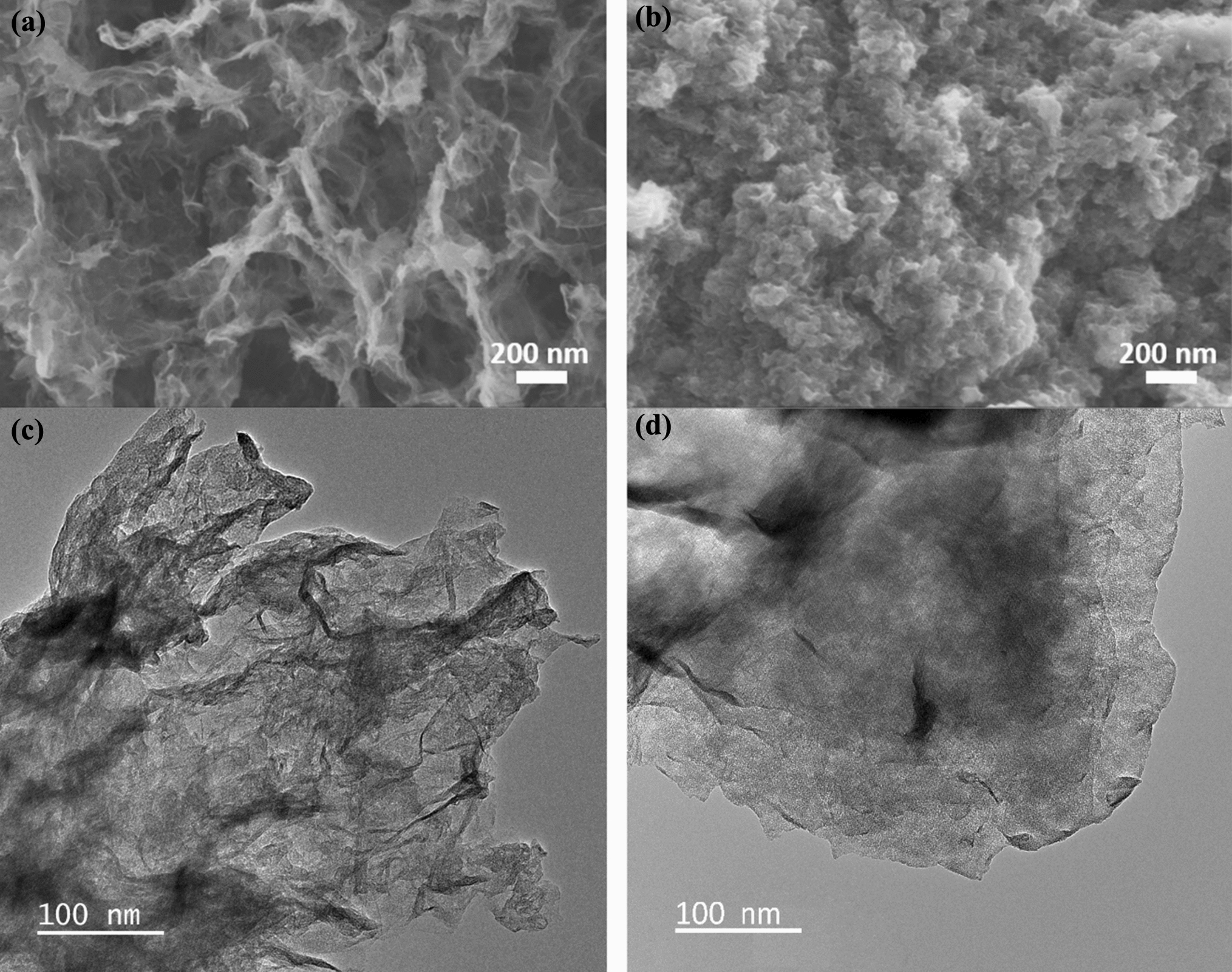 FESEM and HRTEM images of the rGO aero (a,c) and rGO HT (b,d).